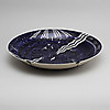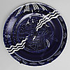 Dekor av figurscen i blå glasyr. Diam 58 cm.