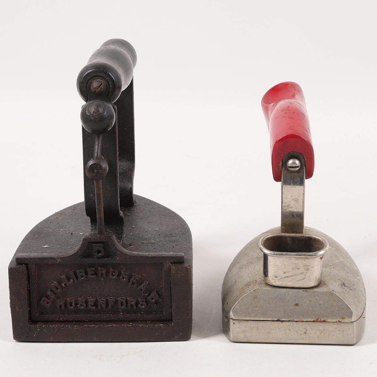 1 strykjärn av gjutjärn med trähandtag, för lod. Luckan är märkt "5" samt "B&O. Libergs F.A.B." och "Rosenfors". Tillverkat någon gång runt förra sekelskiftet.