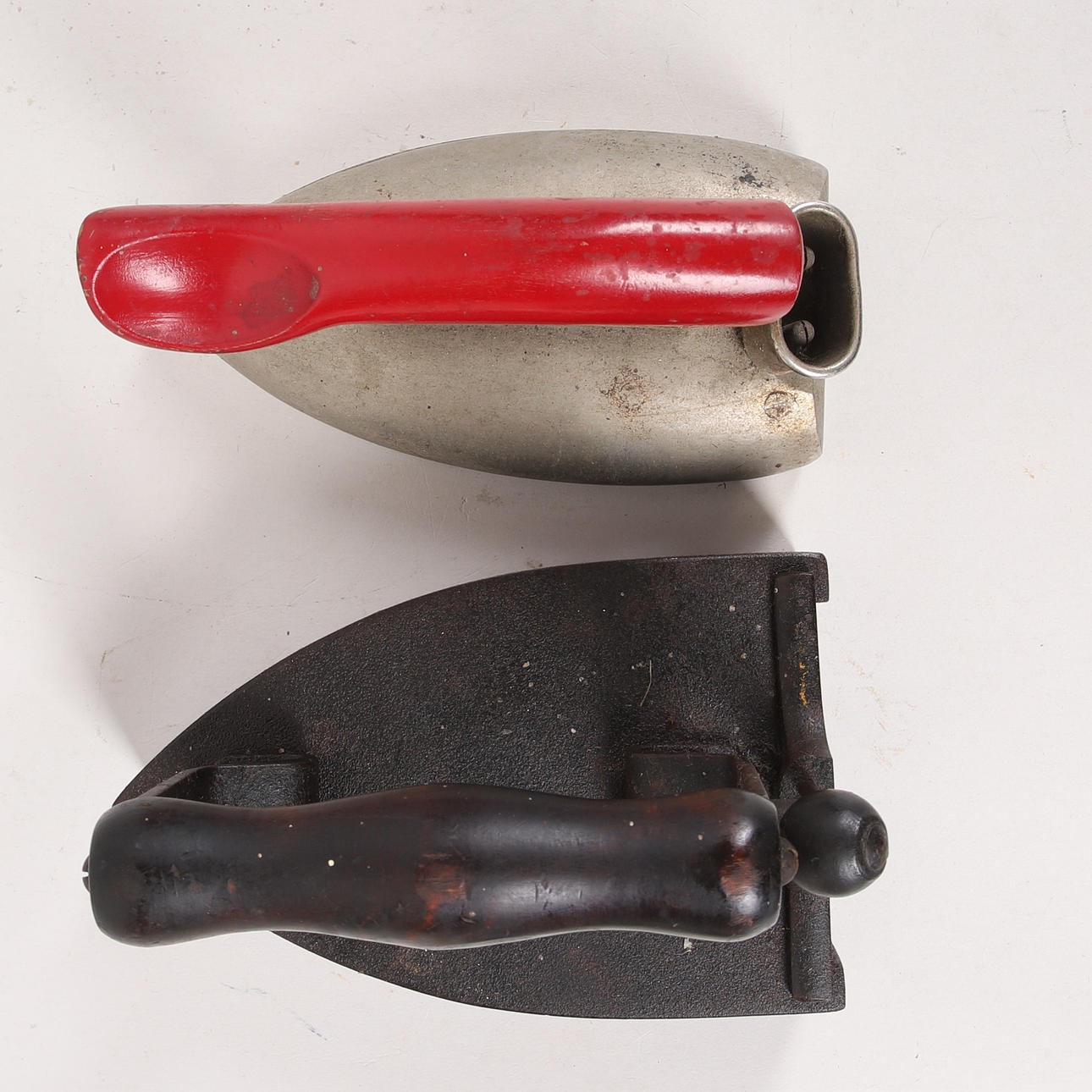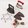 Bruks- och åldersslitage, ytsmuts. Märken och färgskav på trähandtagen. Anlupen/rostig metall, särskilt loden. Flagnande ytbehandling på Svea-strykjärnets metalldelar.