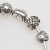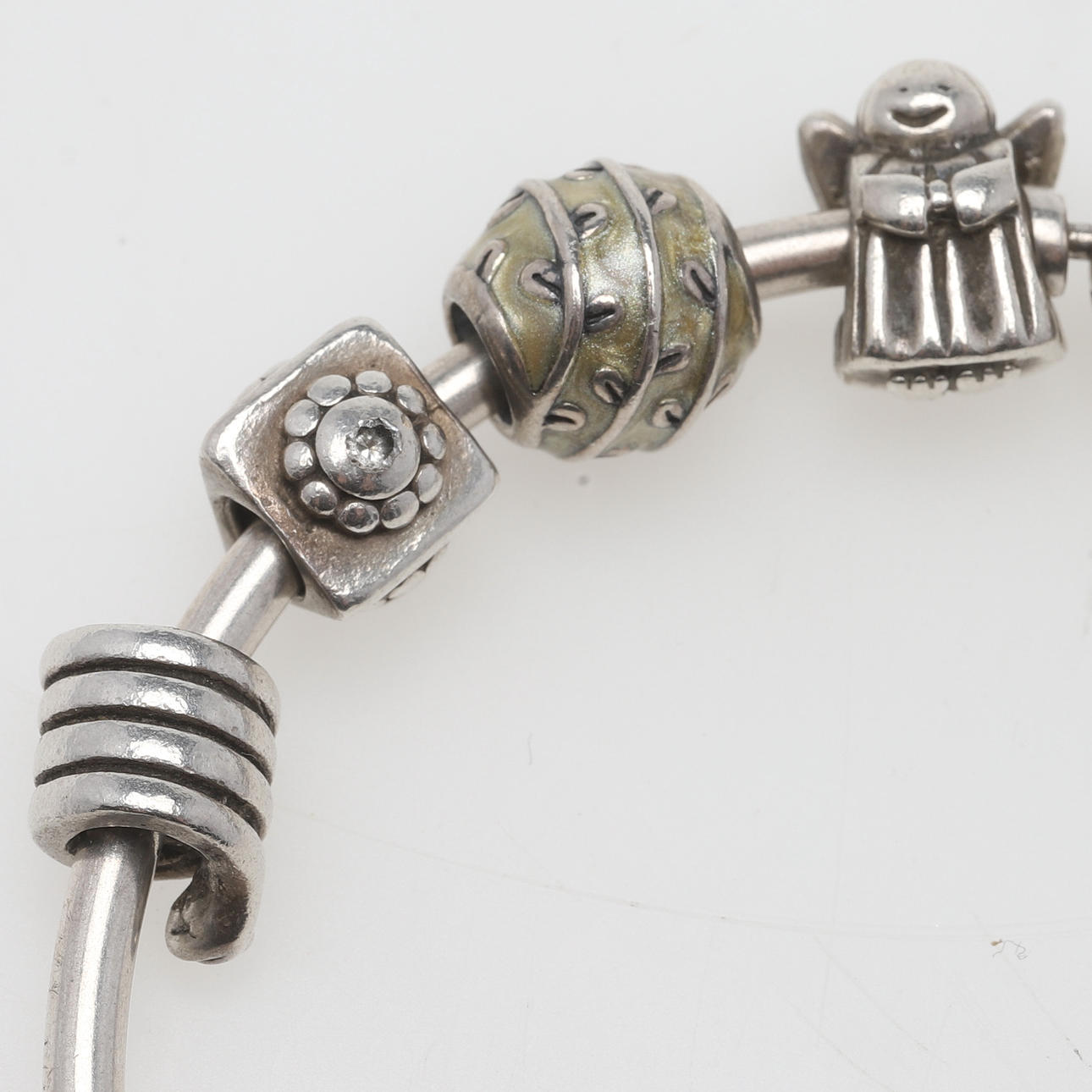 Innerdiameter ca 6 cm, omkrets ca 19 cm. Armringens tjocklek ca 2,8 mm. 7 berlocker, bl.a. ängel, ananas, orm. Vikt ca 32,7 gram.