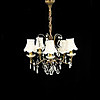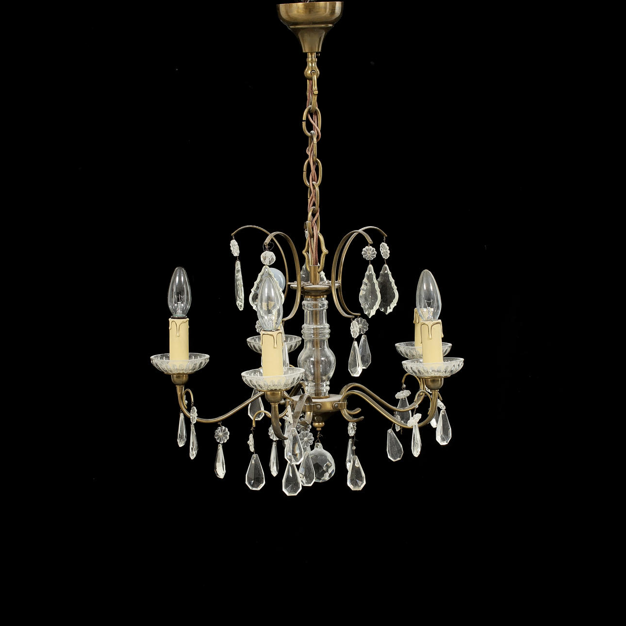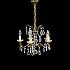 Stomme i metall behängd med prismor. Fem ljusarmar.