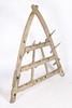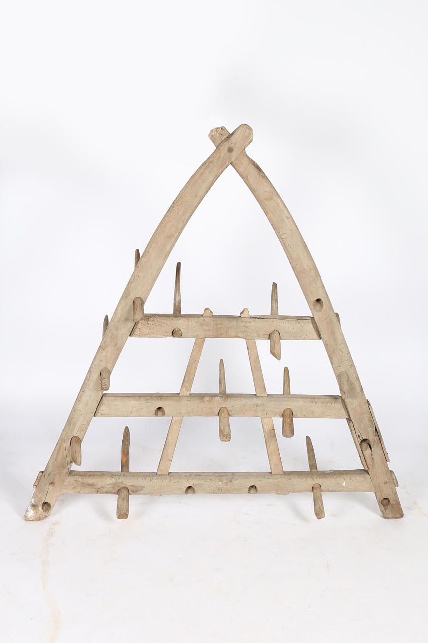 I triangulär form med träspikar som galgar, 115cm breda, 116cm höga.