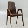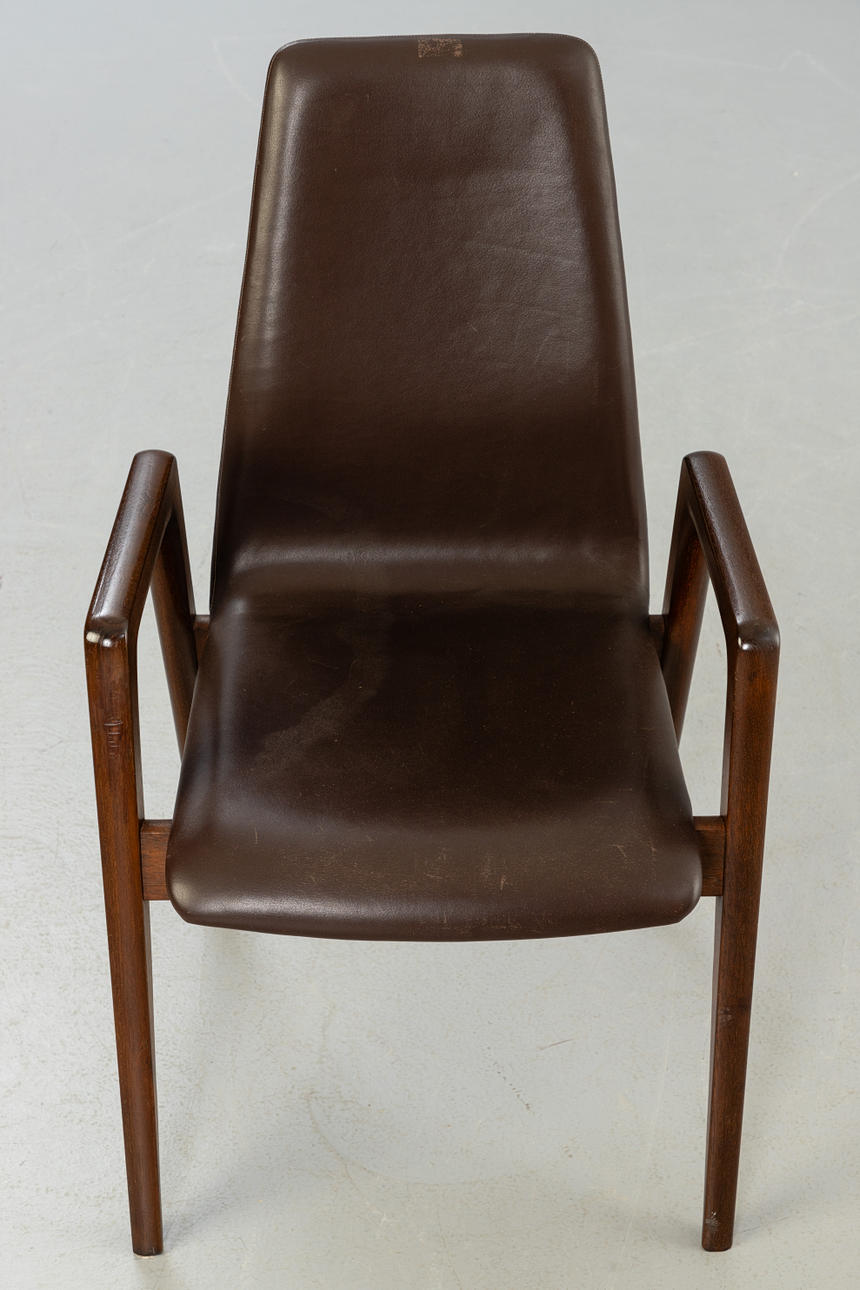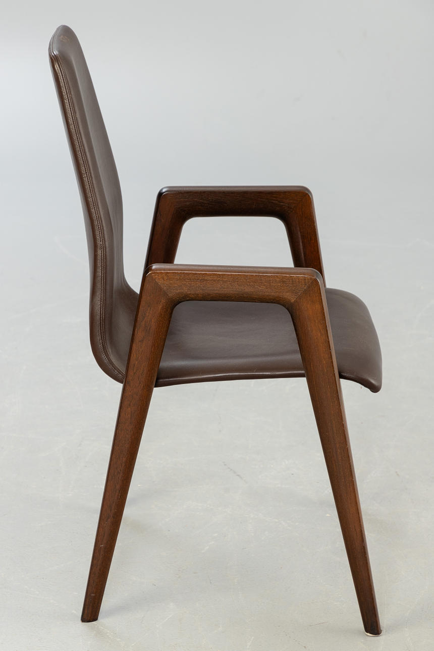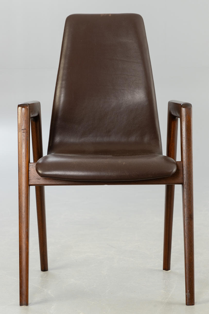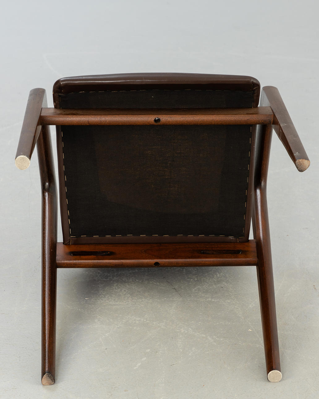 Danmark, 1970-tal. Mörkt trä, stoppat sätesskal och täckt med brunt läder.