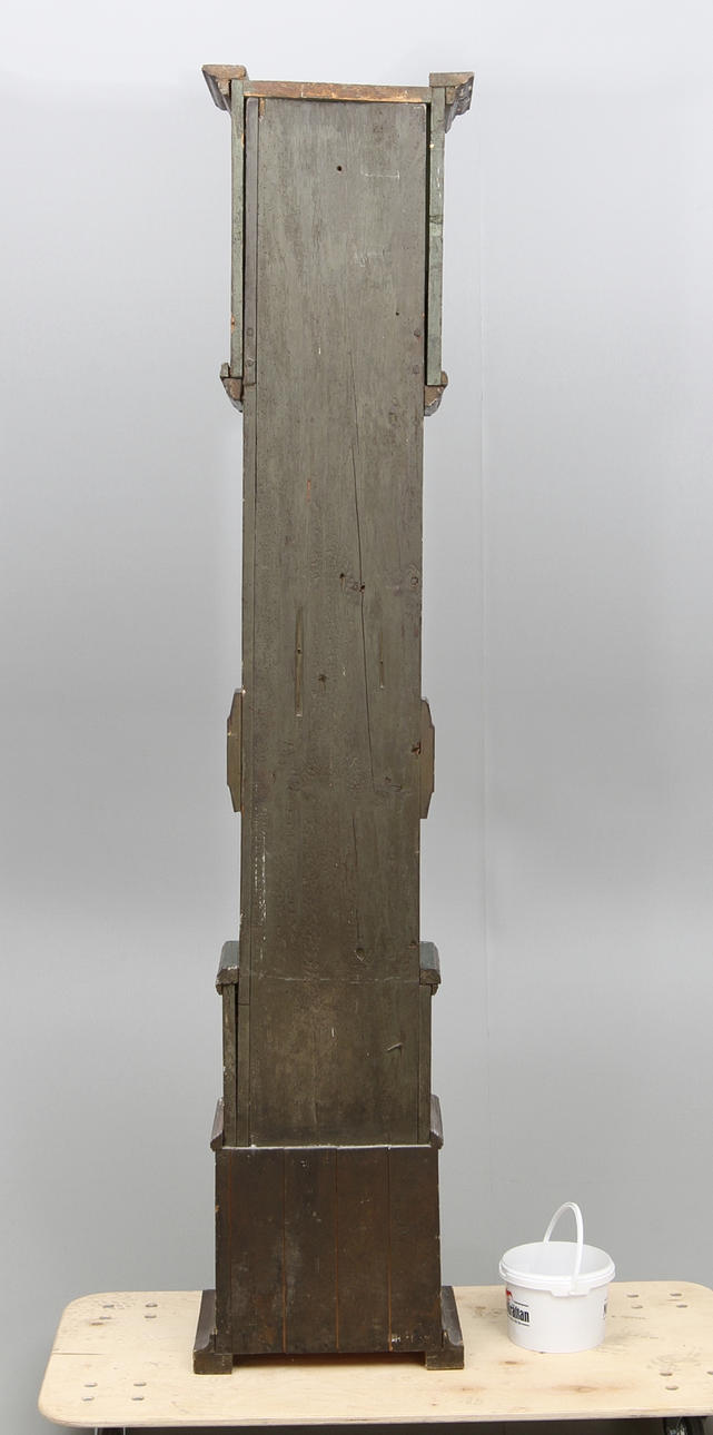 Urverk med romerska och arabiska siffror, signerat IEW. Grönmålat fodral med blomsterdekor, märkt 1710, lod och pendel medföljer. Höjd 215 cm.