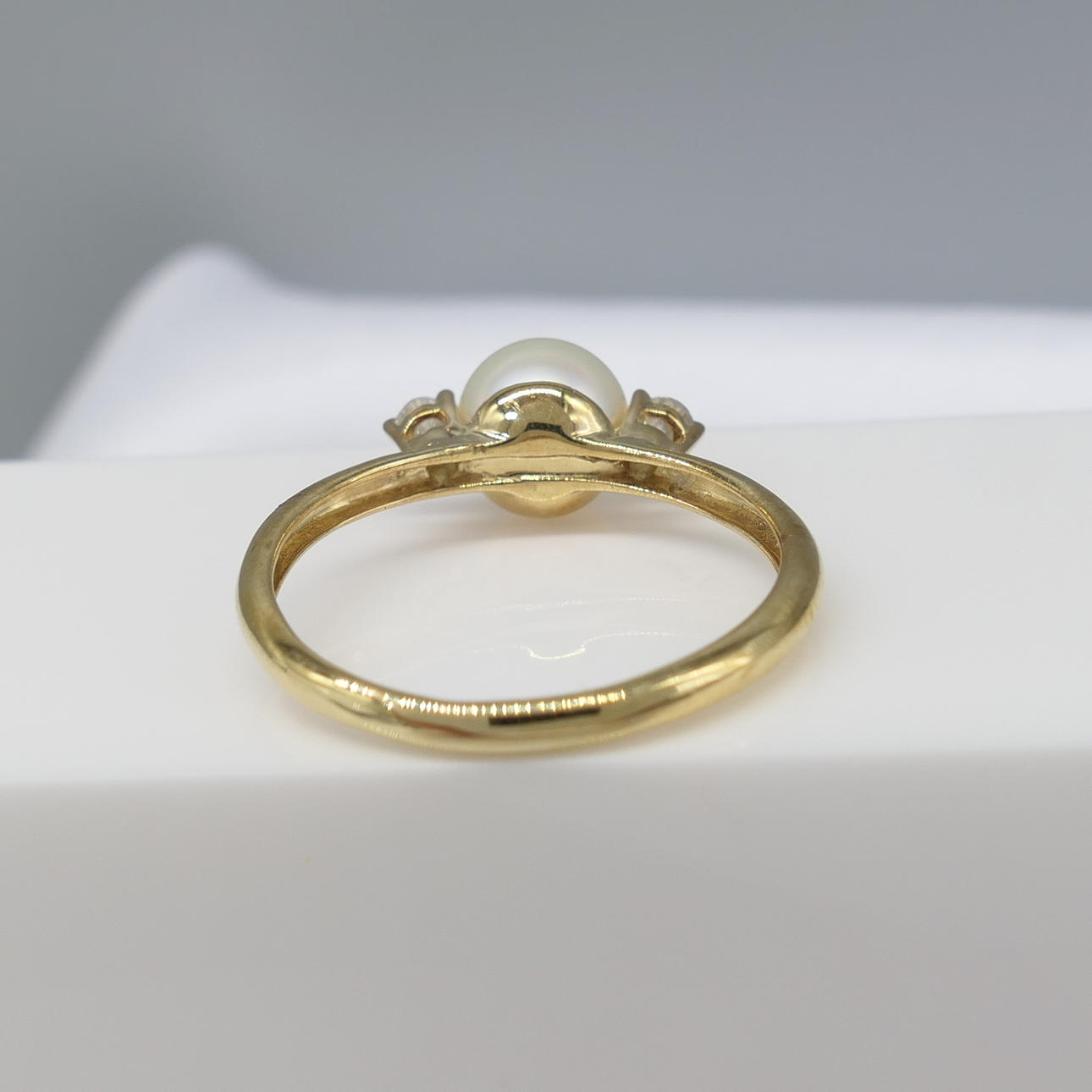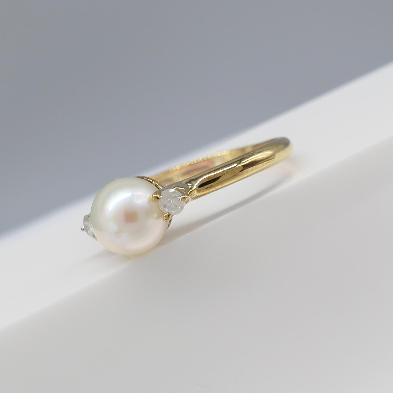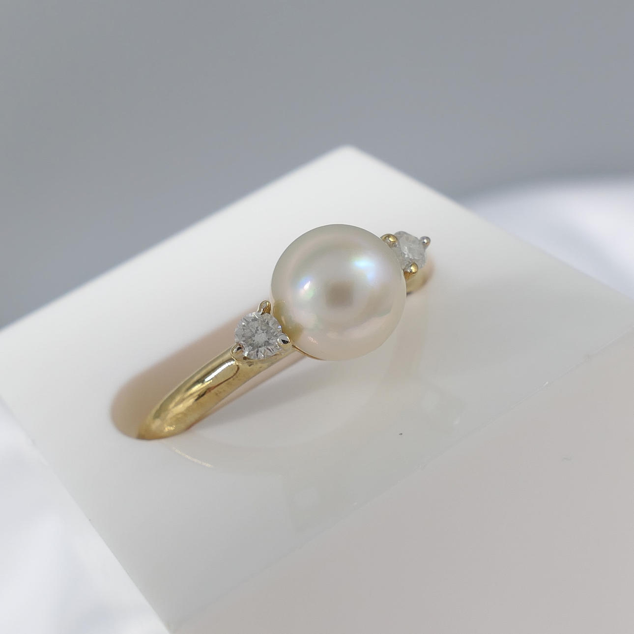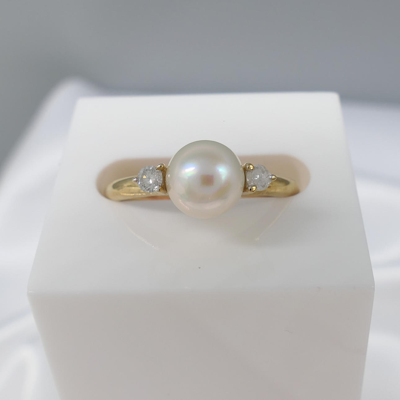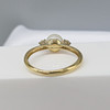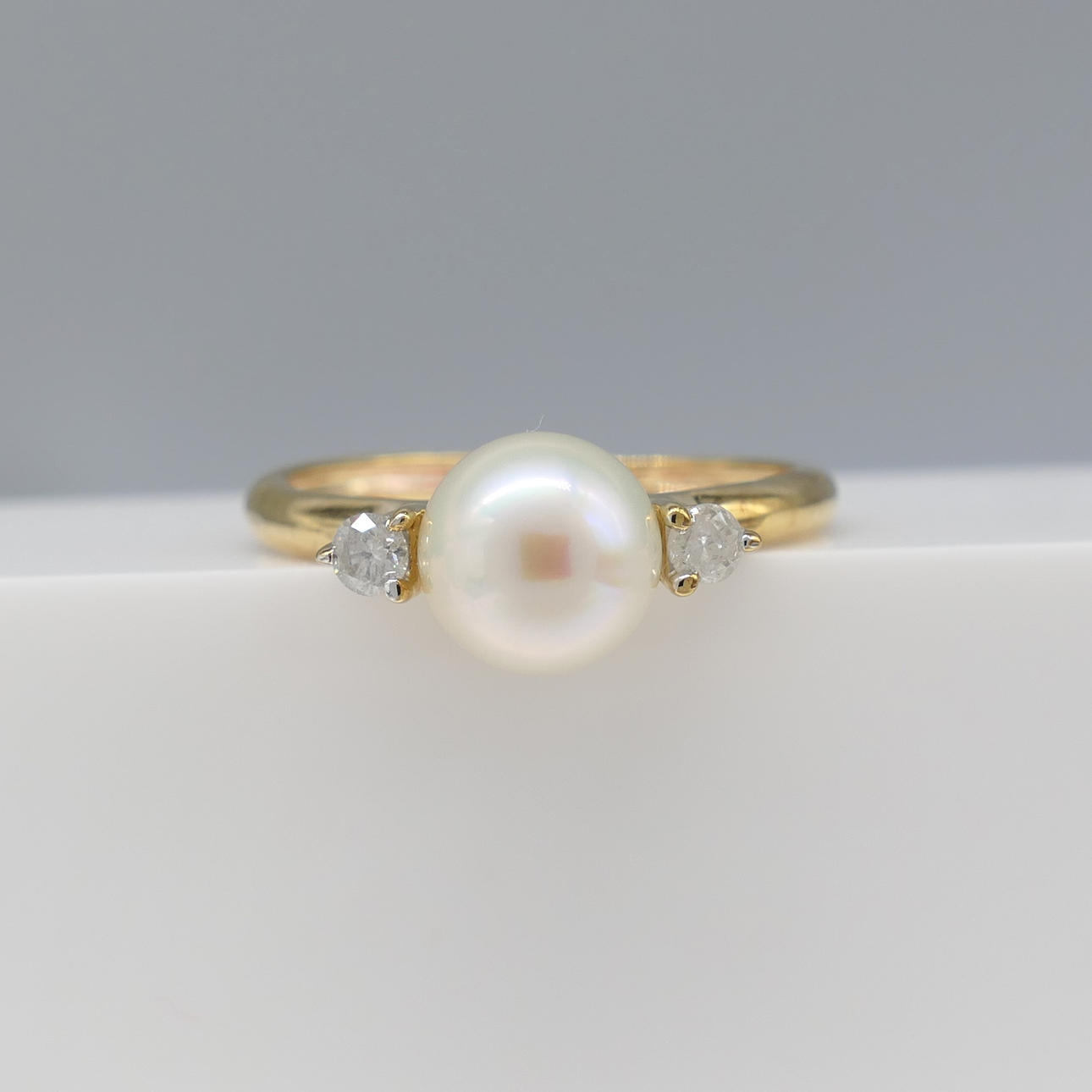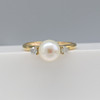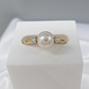 Två runda briljantslipade diamanter, totalt 0.08ct, ca klor infattade till ringen, flankerar pärlan.