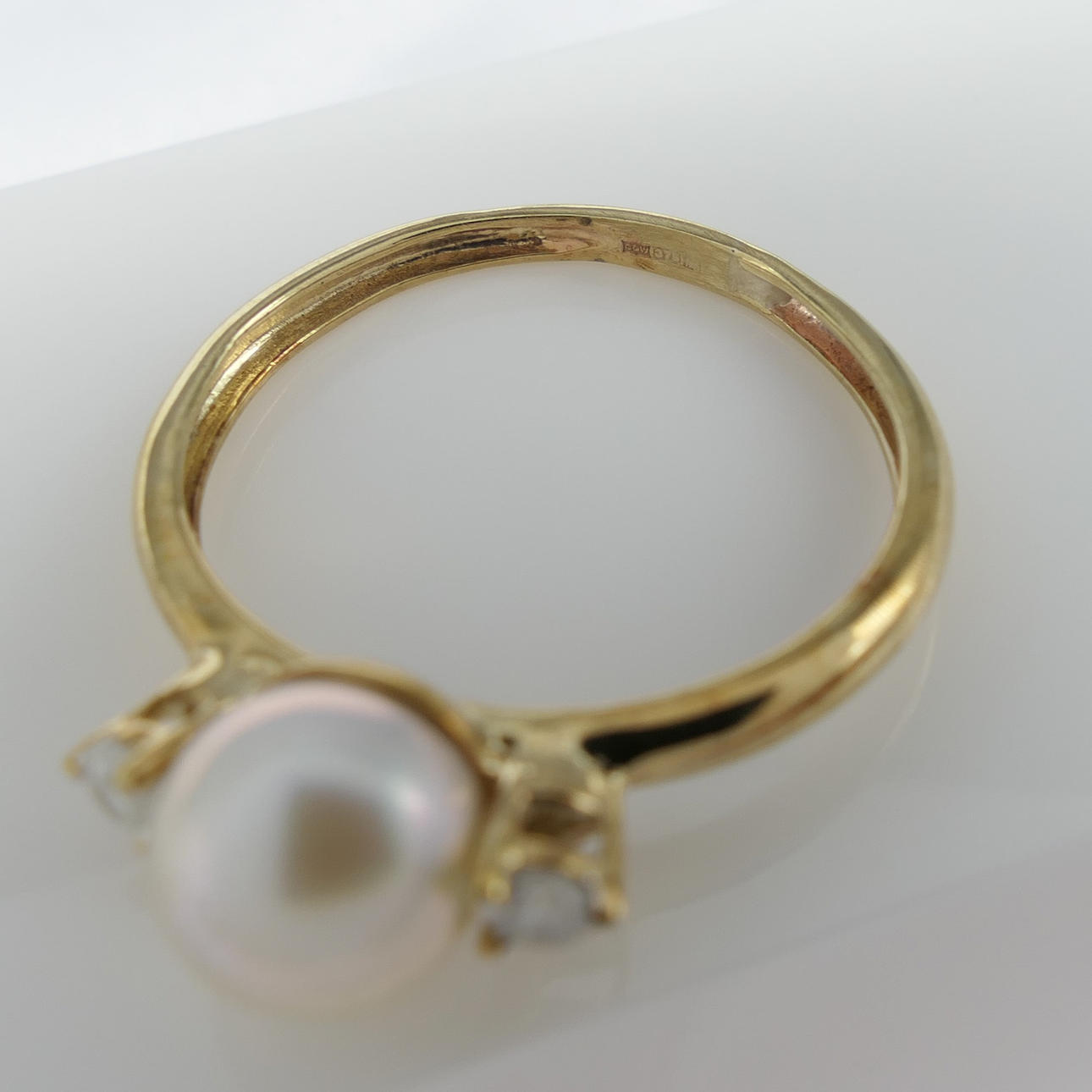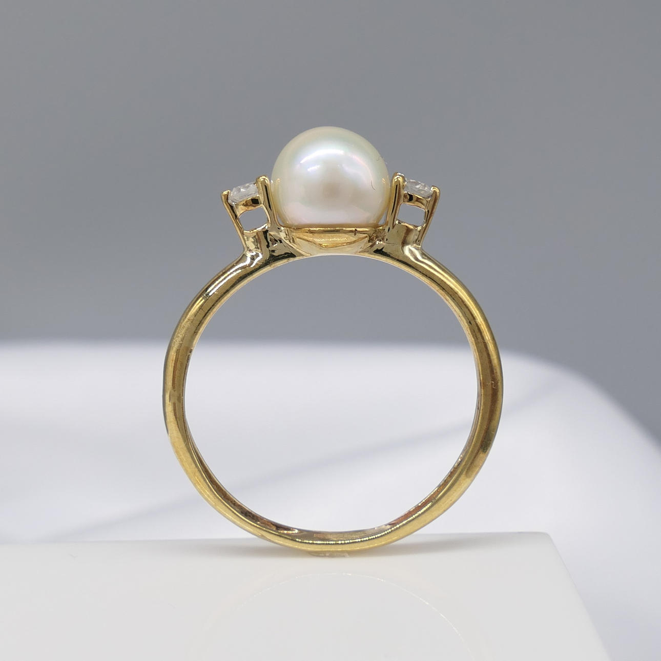 Den centrala ädelstenen i denna ring är en naturlig rund vit odlad pärla med 7 mm diameter ca..