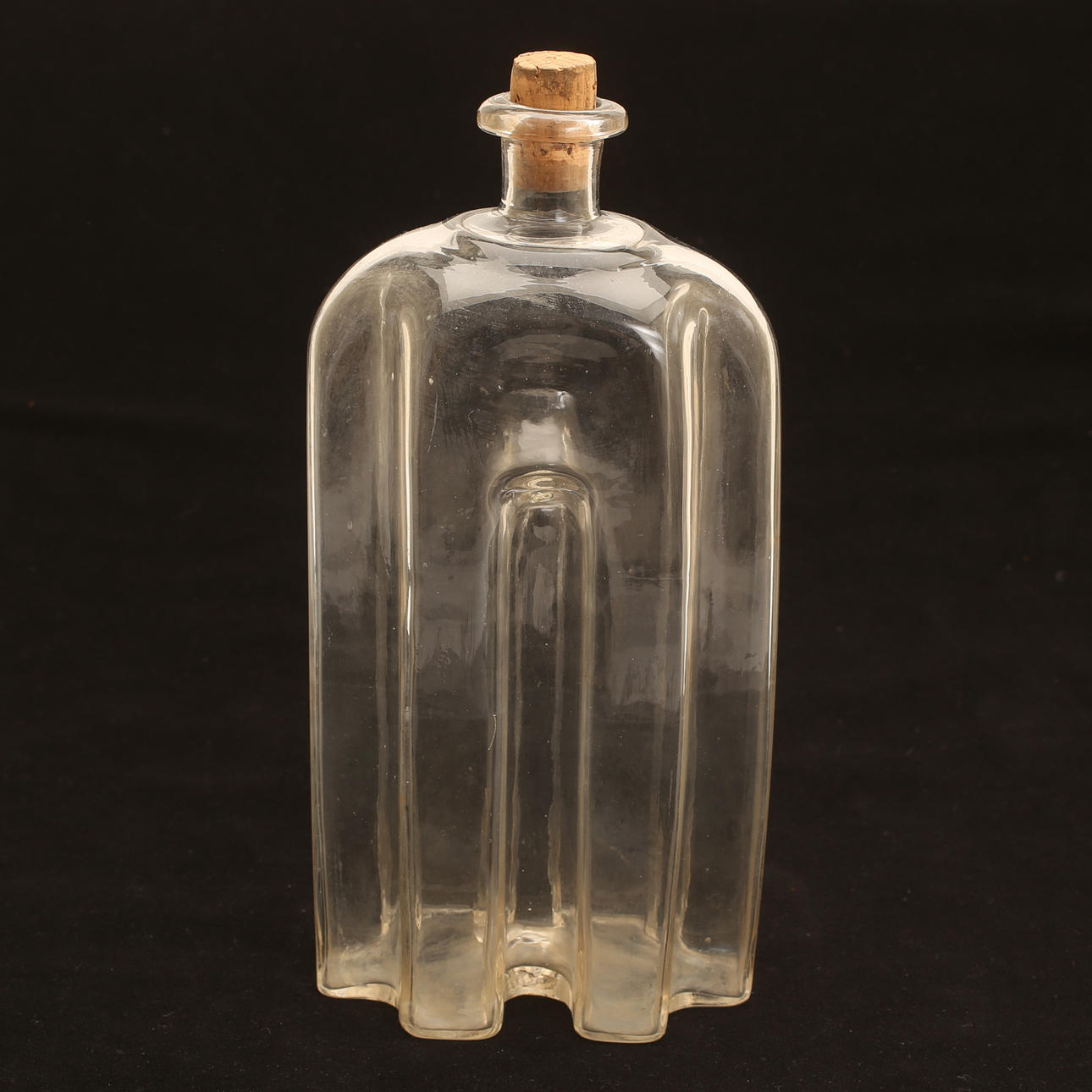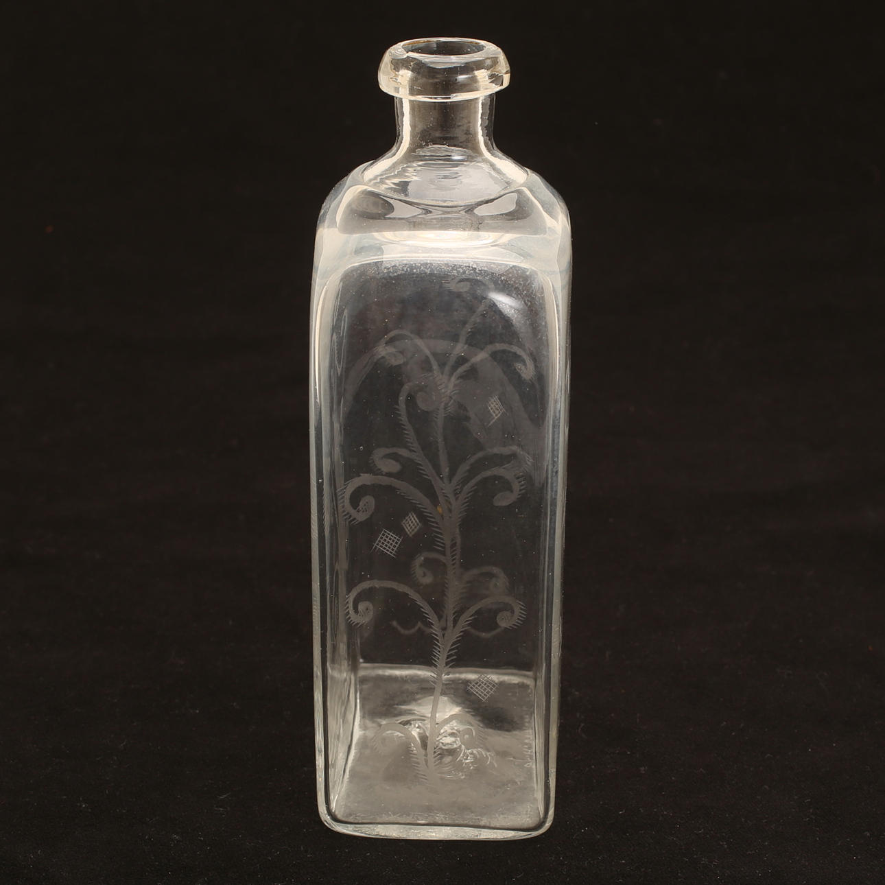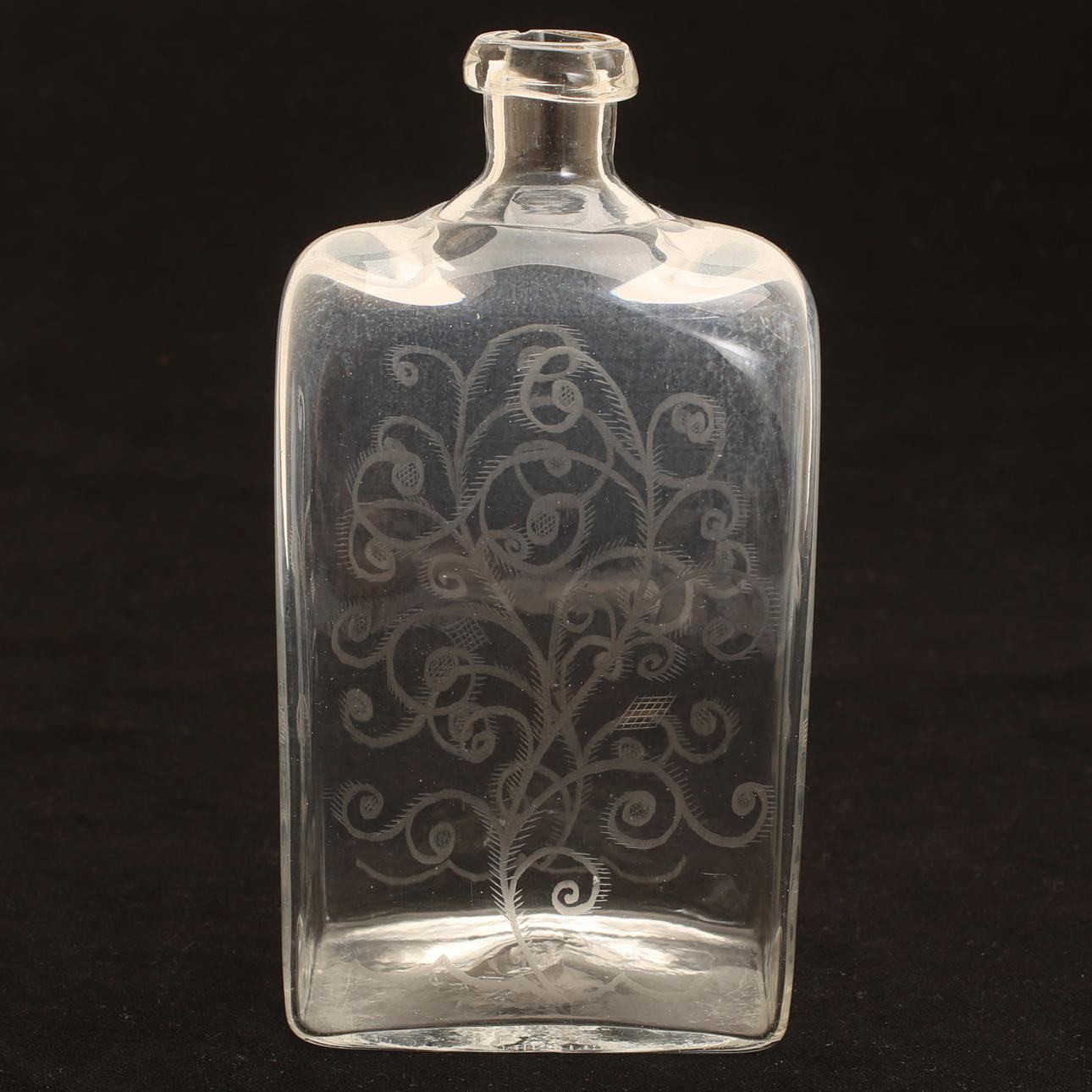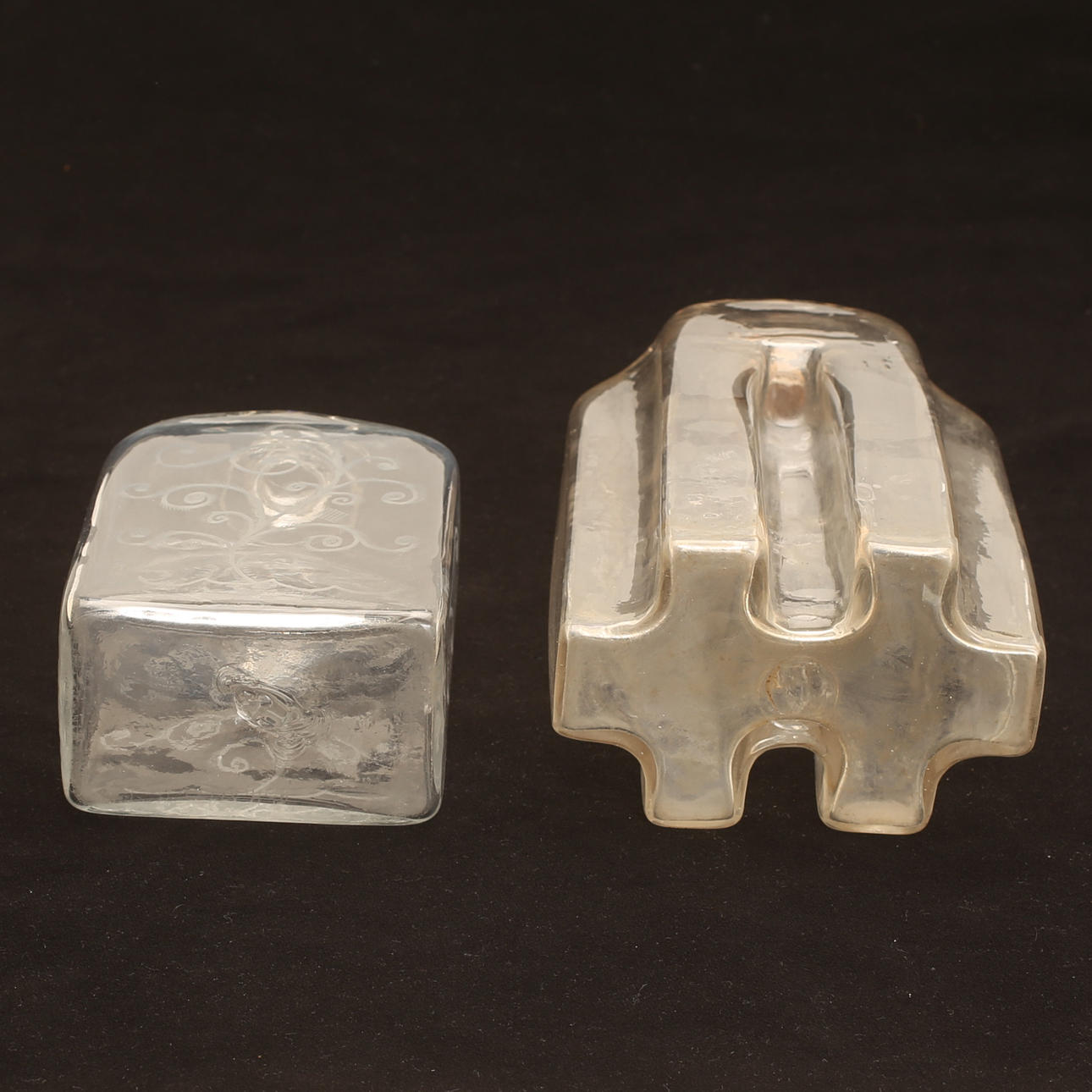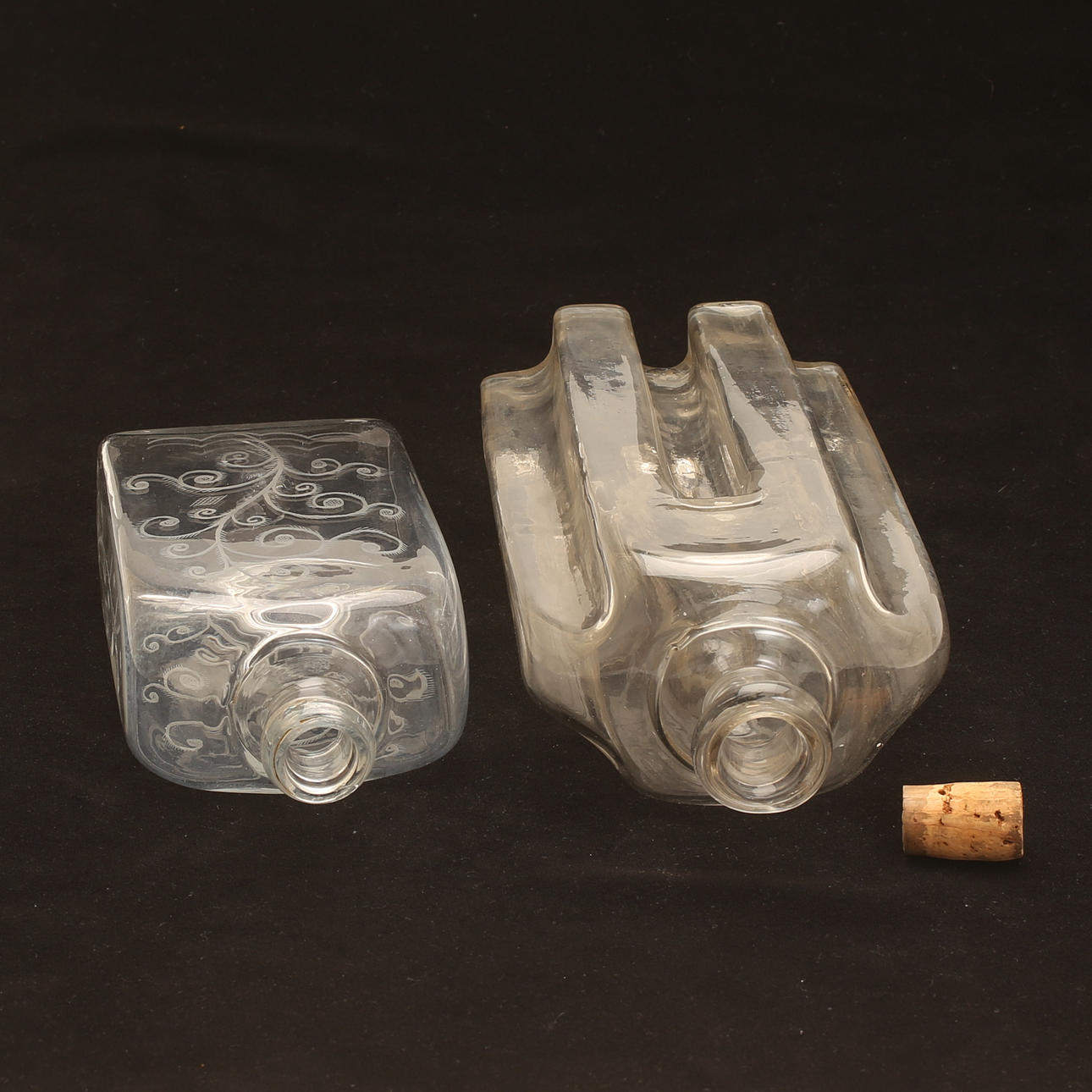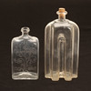 Den ena med etsad dekor, den andra s k greppaflaska. Höjd ca 26 cm respektive 20 cm.