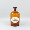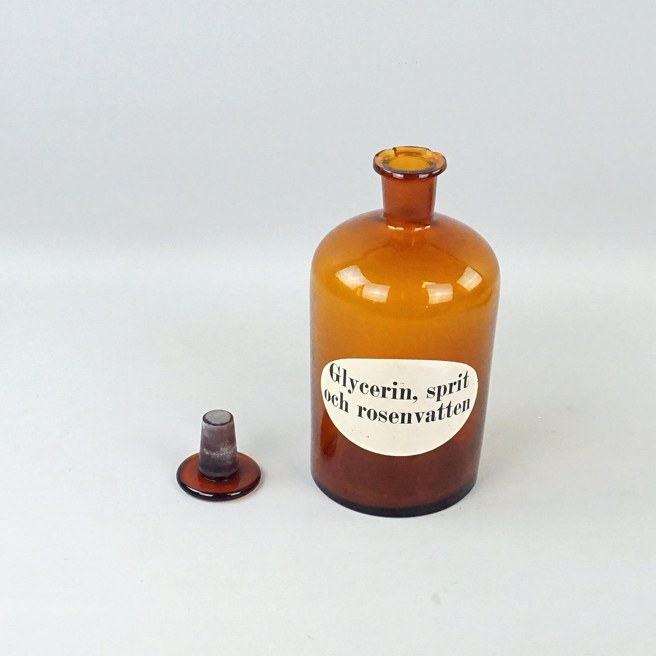 Apoteksflaska med texten "Glycerin, sprit och rosenvatten". Höjd ca 26,5 cm, diameter ca 12,5 cm.