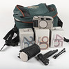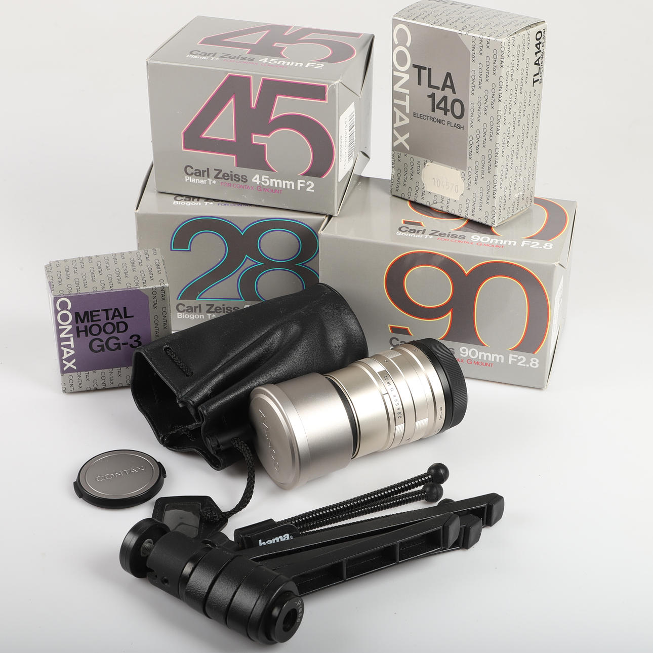 Med tillbehör bl. a. 3 objektiv, Carl Zeiss, 28, 45 och 90 mm och väska mm