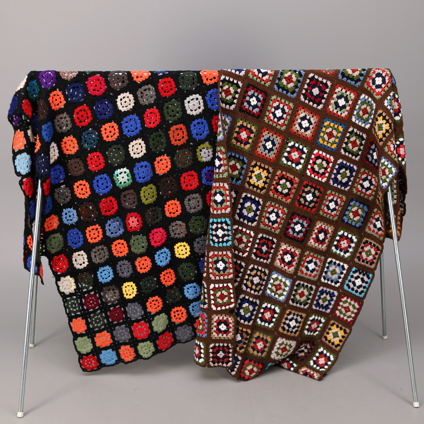 307418. PLÄDAR 2 st, virkade, mormorsrutor.