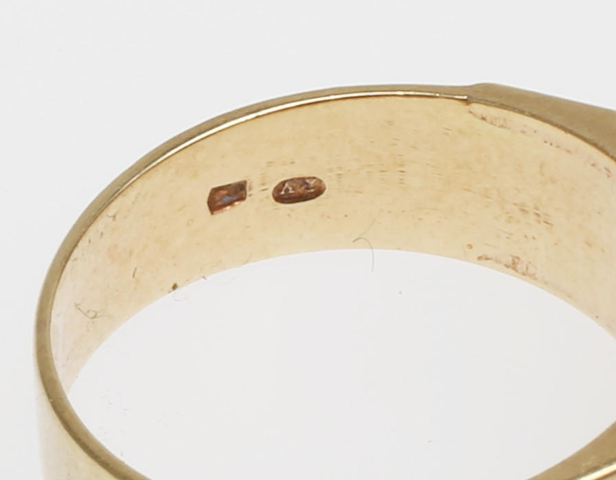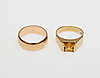 Klackring 18 k, vikt 3,9 gram. Ring slät, 14 k, vikt 5,4 gram. Utländska stämplar, testade med syra.