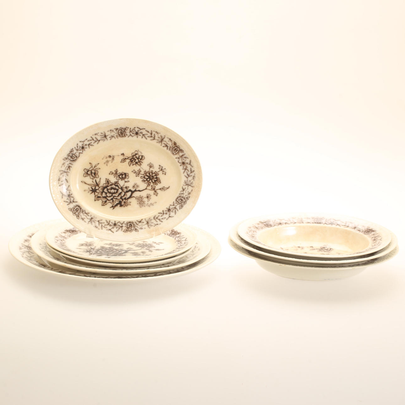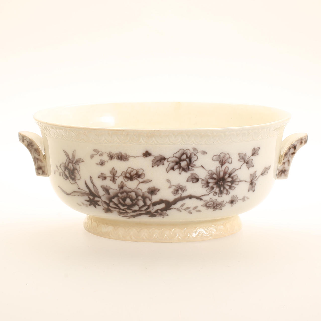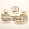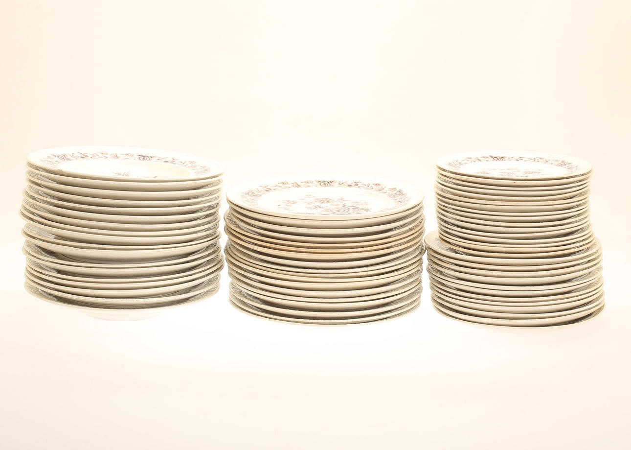 Tallrikar, 18 st, diameter ca 25 cm. Djupa tallrikar, 18 st, diameter ca 25 cm. Förrättstallrikar, 12 st, diameter ca 22 cm. Assietter, 16 st, diameter ca 20 cm. Uppläggningsfat, längd ca 34 cm. Uppläggningsfat, längd ca 29 cm. Uppläggningsfat, 2 st, längd ca 24 cm. Skålar, 2 st, längd ca 27 cm. Skål, längd ca 24 cm. Terrin, längd ca 27 cm. Skål, längd ca 18 cm. Kanna, höjd ca 16 cm. Såssnipa, längd ca 18 cm.