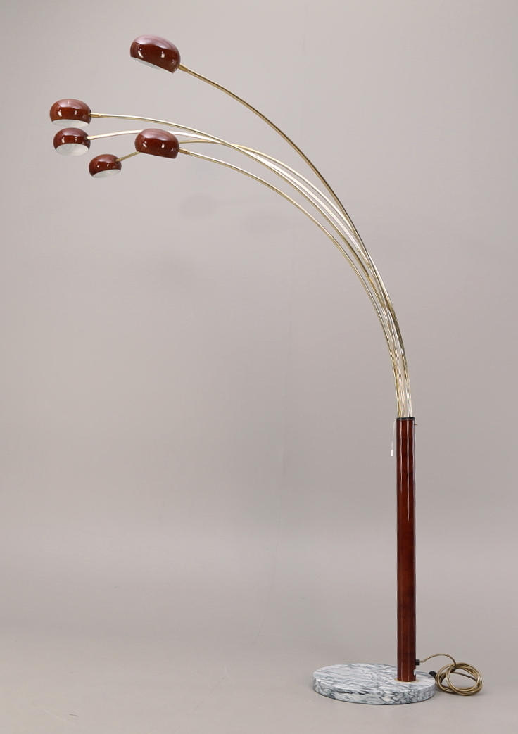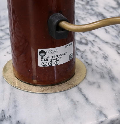 Fot i sten, 5 vridbara ljusarmar, brun lack, gulmetall. Höjd ca 200 cm.
