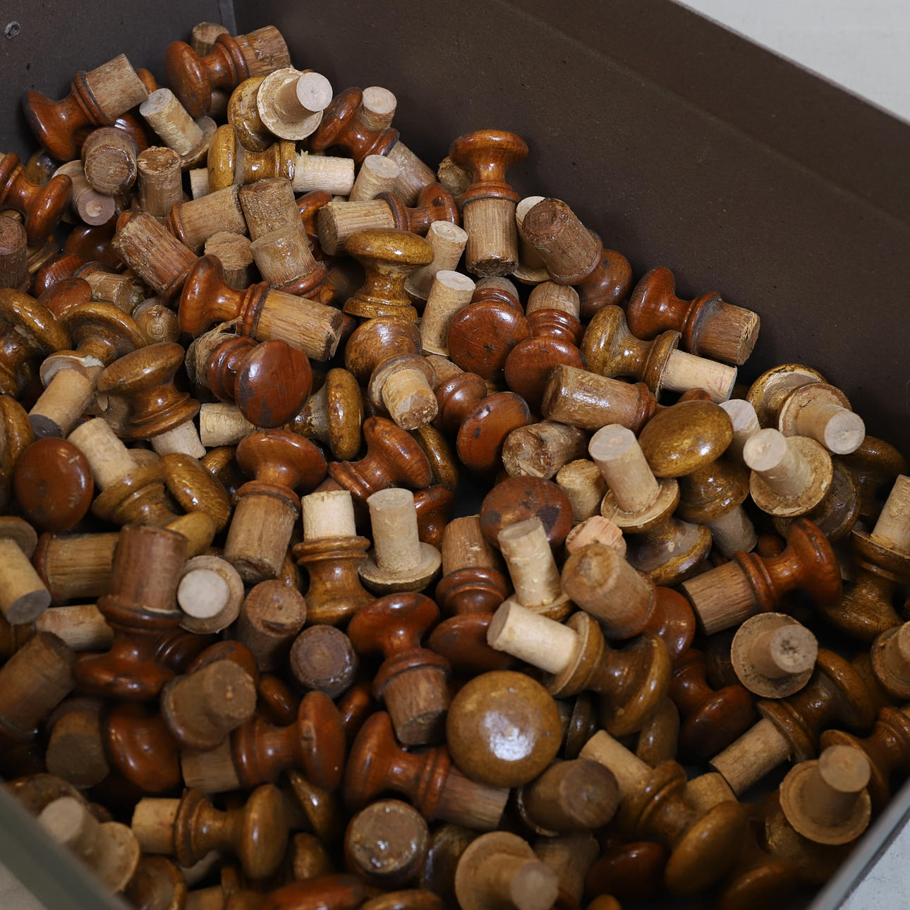 Större antal svarvade knoppar till mbelproduktion. Längd ca 55 mm, diameter knopp ca 32 mm.