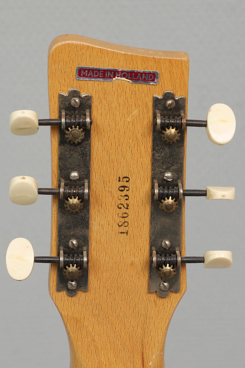Gitarrens arm har böjt sig framåt en aning, Ytsmuts, åldersslitage.