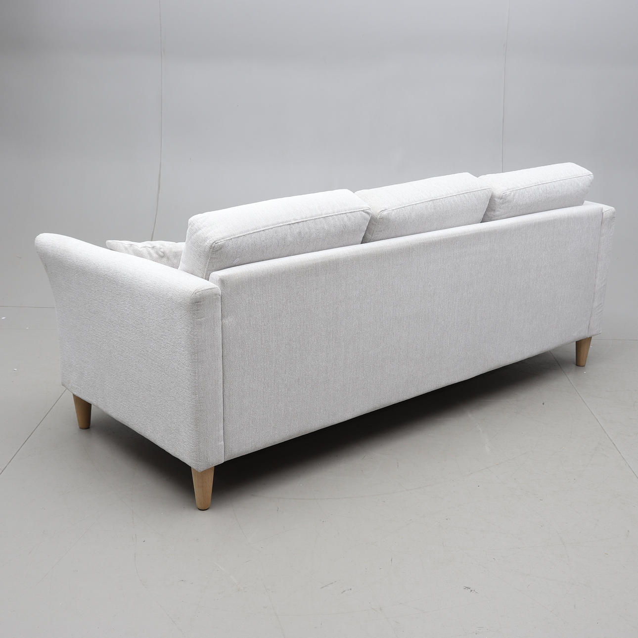 Lösa plymåer i rygg och sits, samt två medföljande kuddar. Längd ca 205cm, bredd ca 85cm, sitthöjd ca 43cm. Inköpt 2021 enl. uppgift.