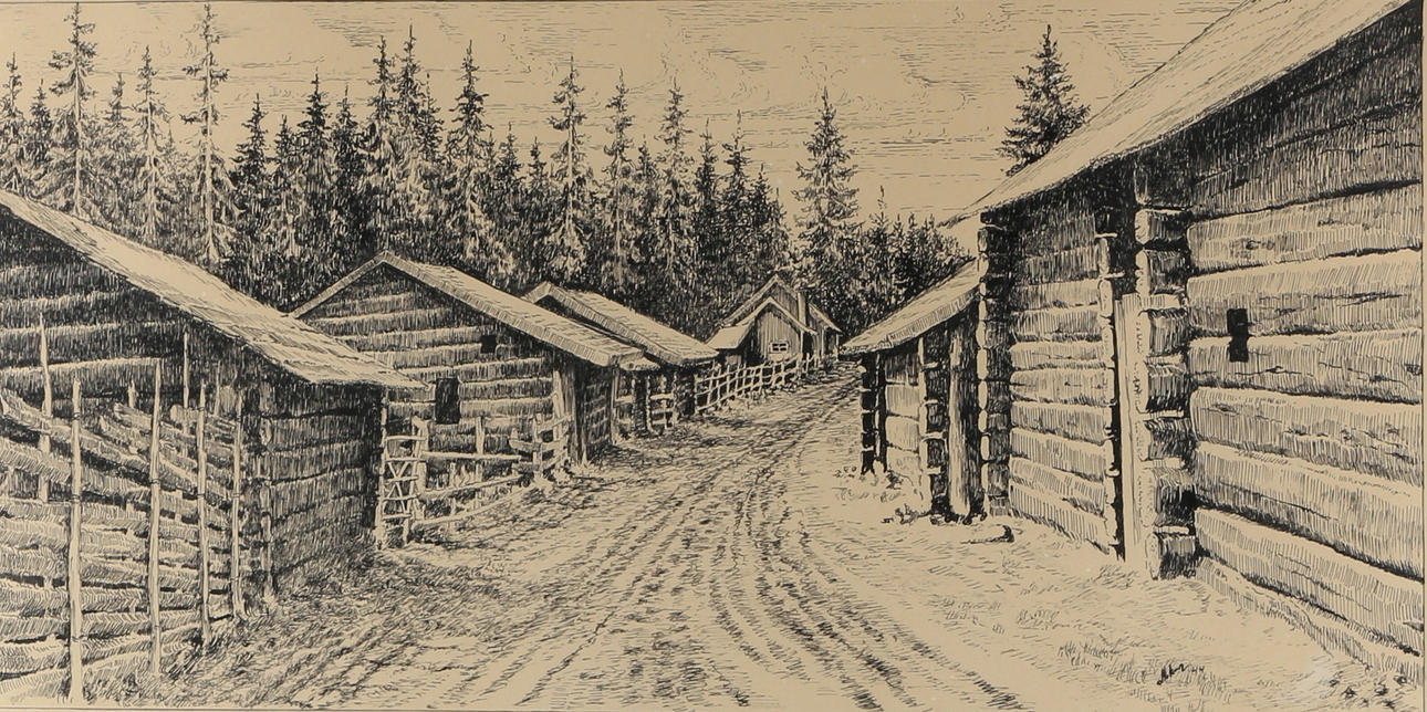 Stugor vid väg, 31 x 52 cm, signerad 44.