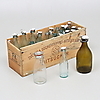 Flaskorna med porslinslock, 1 märkt "Broakulla". Lådan märkt "Svenska Sockerfabriks Aktiebolaget" höjd 25,5 cm, längd 67 cm.