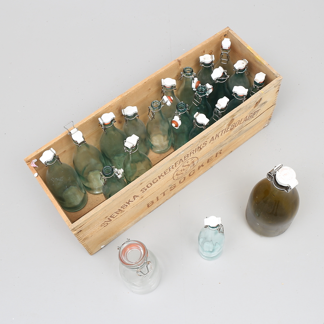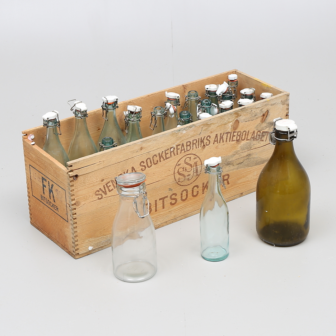 308464. DRICKAFLASKOR, 21 st, samt TRÄLÅDA för bitsocker.