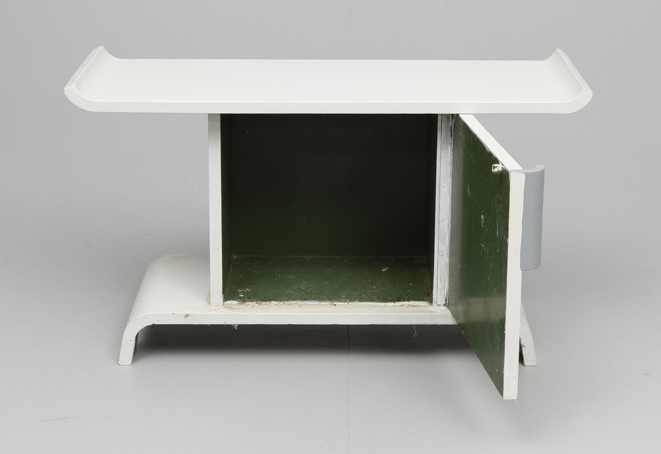 Vit och gråmålat, skuren dekor, skåp under skivan. Längd 85, bredd 34, höjd 47 cm.