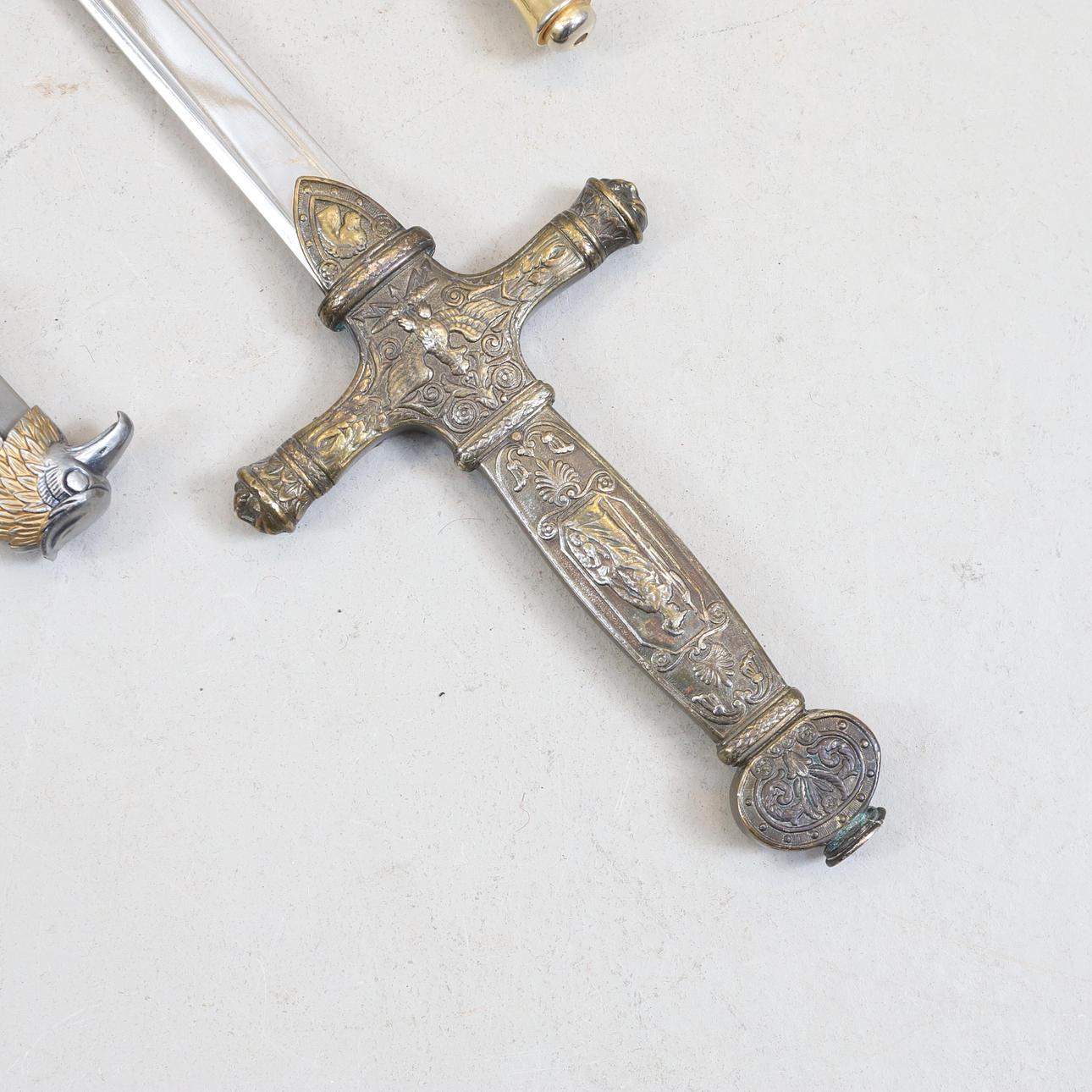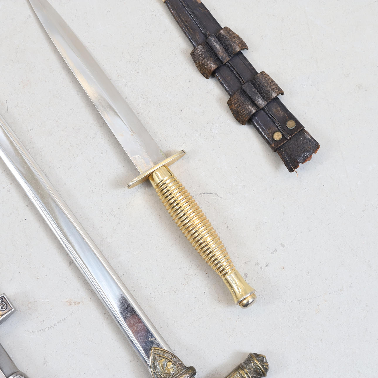 1 st Svärd, längd ca 86 cm. 1 st kniv, längd ca 31,5 cm (inkl slida). 1 st dolk, replika, Senatus Populusque Romanus, längd ca 34 cm (inkl slida).