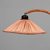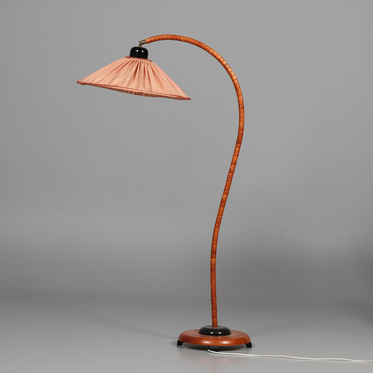 Rödbetsat lövträ med veckad textilskärm. Etikettmärkt. Höjd ca 160 cm.
