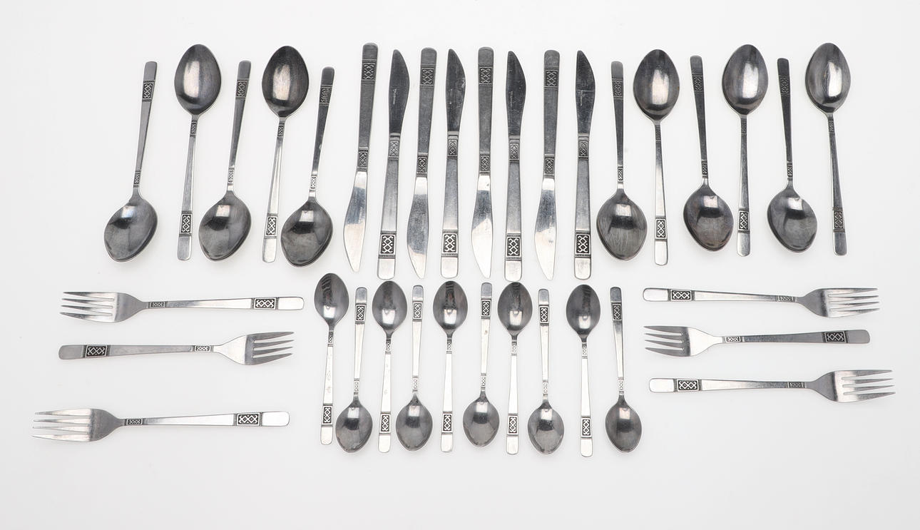 Matskedar 11 st, längd ca 19 cm Gafflar, 6 st, längd ca 18,5 cm Knivar, 8 st, längd ca 21 cm Kaffeskedar, 10 st, längd ca 13 cm.