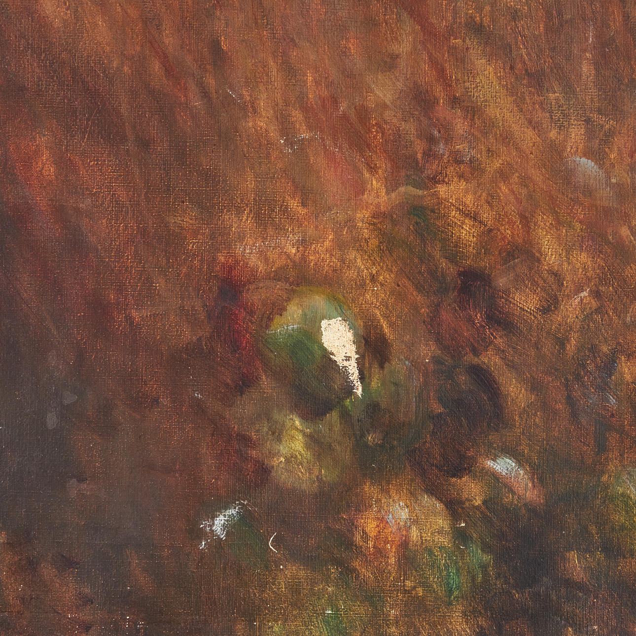 Ej uppspänd på spännram, ihoprullad. Färgbortfall, skrapmärken.