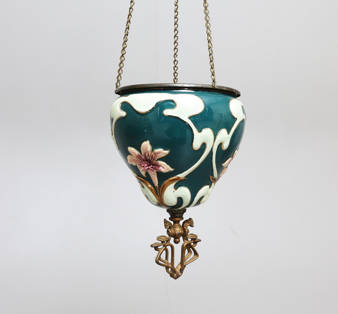 Med jugenddekor, ytterfoder i keramik, innerdel samt kedjor i mässing.