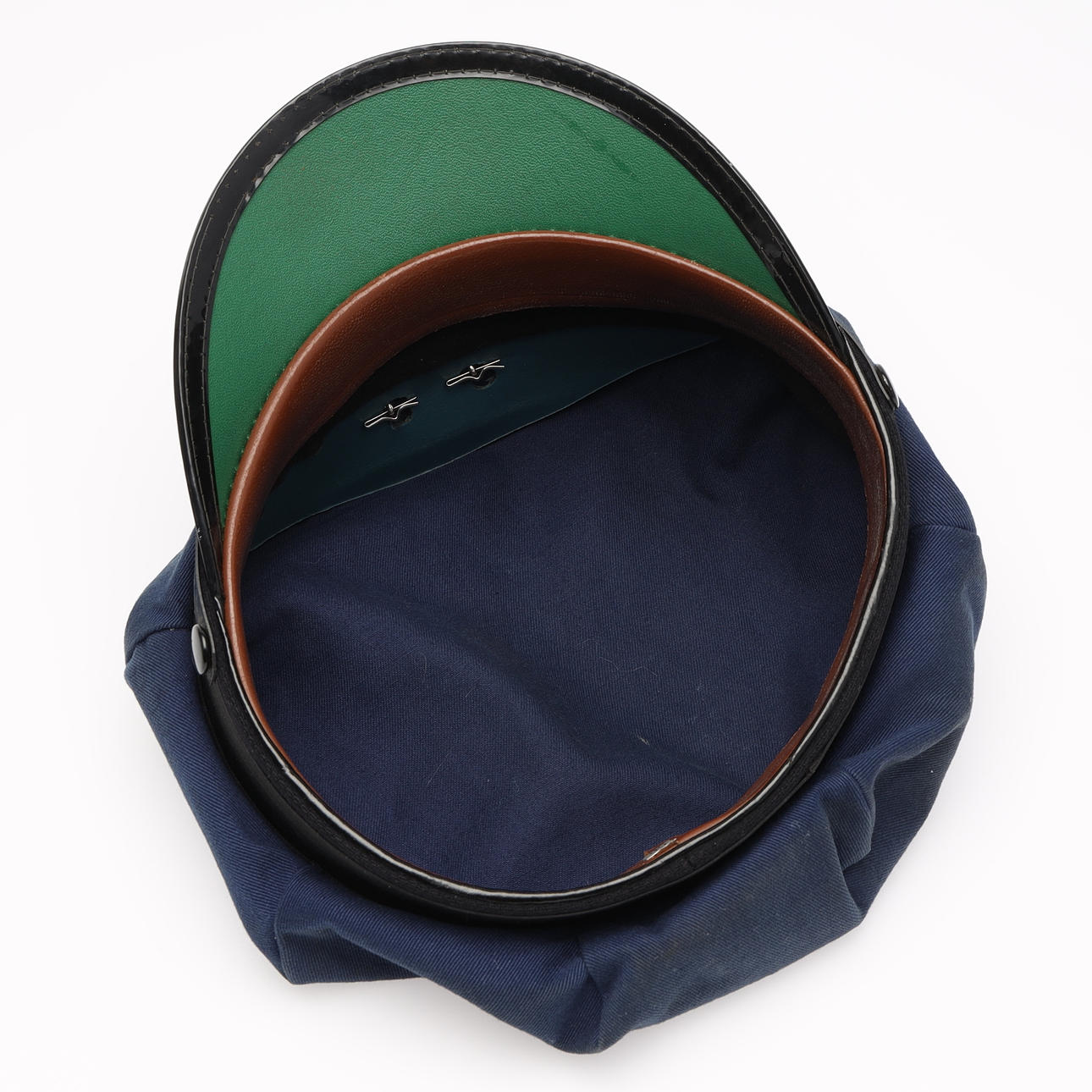 Keps i bomullstyg, insidans detaljer i skinn, skärm i hårdplast, märke i metall.
