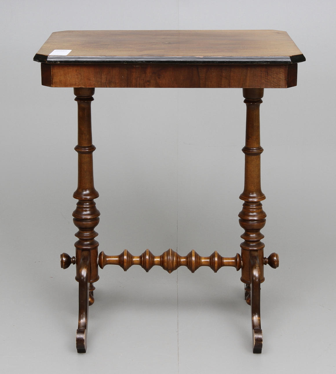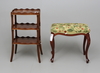 Pall, rokokostil, Alsterbro Möbler, mahogny, längd 51 cm. Fönsterbord, nyrenässans, valnöt, längd 63 cm. Hylla, mahogny, höjd 66 cm.