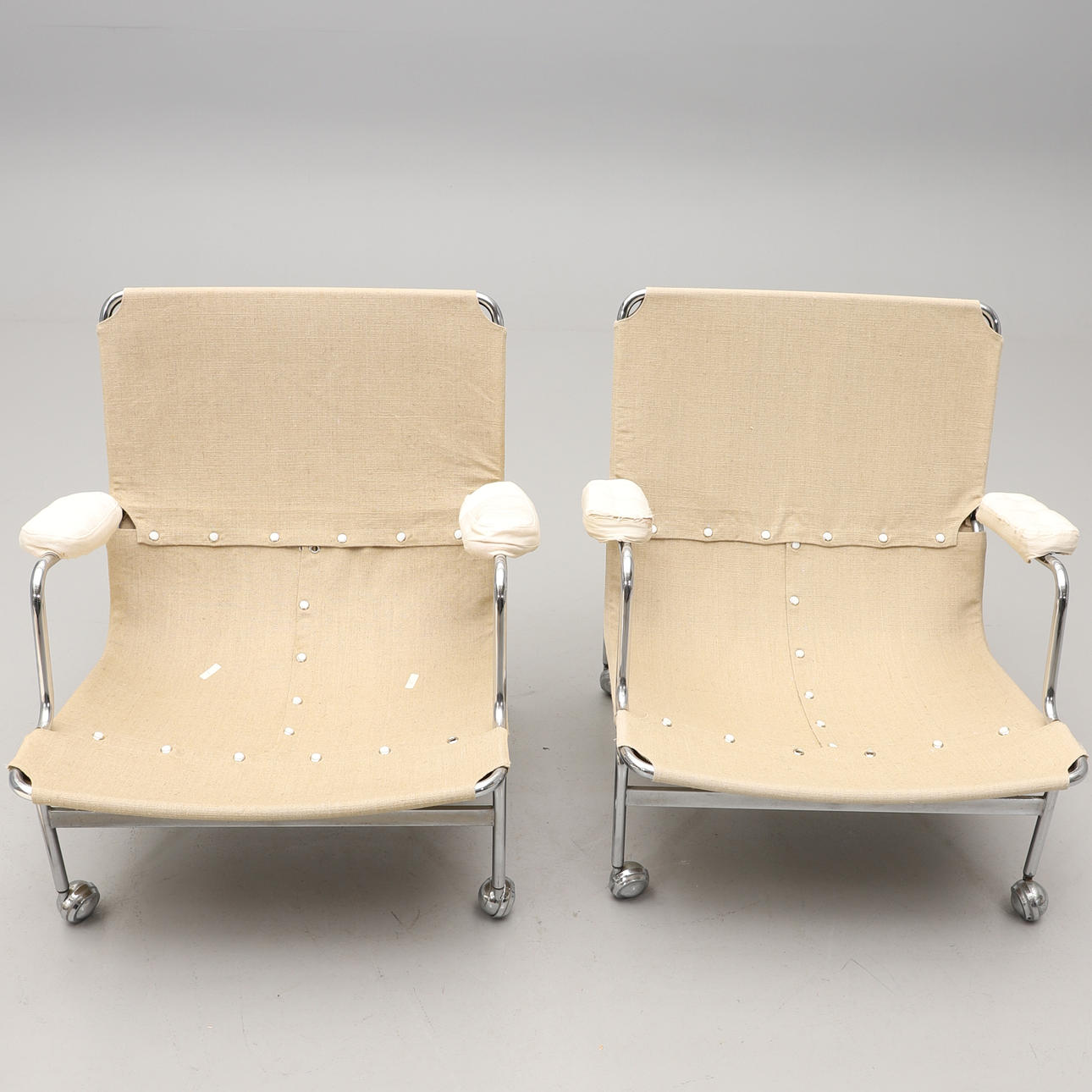 Bruksslitage. Fläckar. Senare omklädda. Nya trissor till en fåtölj medföljer.