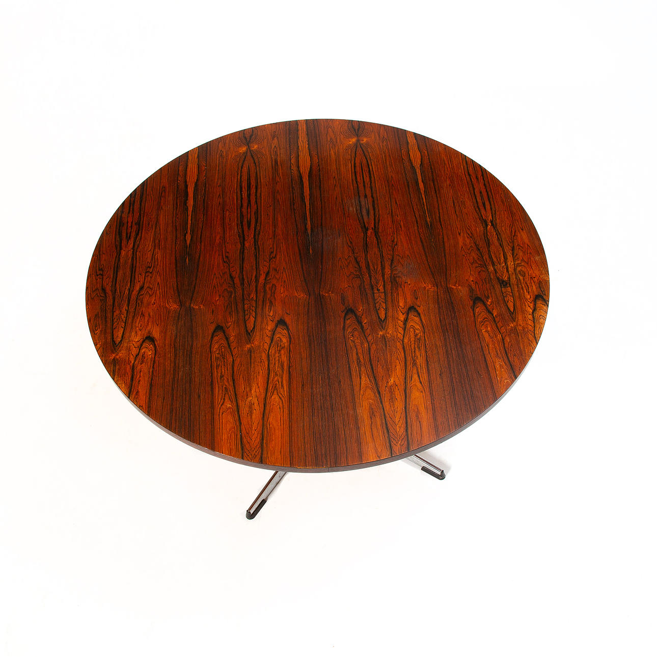 Rund bordsskiva fanerad med palisander. Kromat underrede på fyrpassfot. Brännmärkt. Höjd 57, diameter 88 cm. CITES-intyg finns.