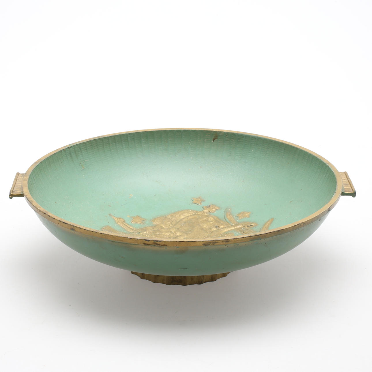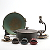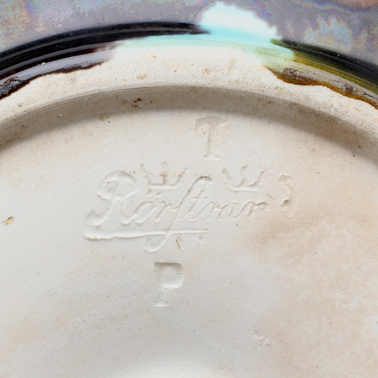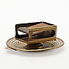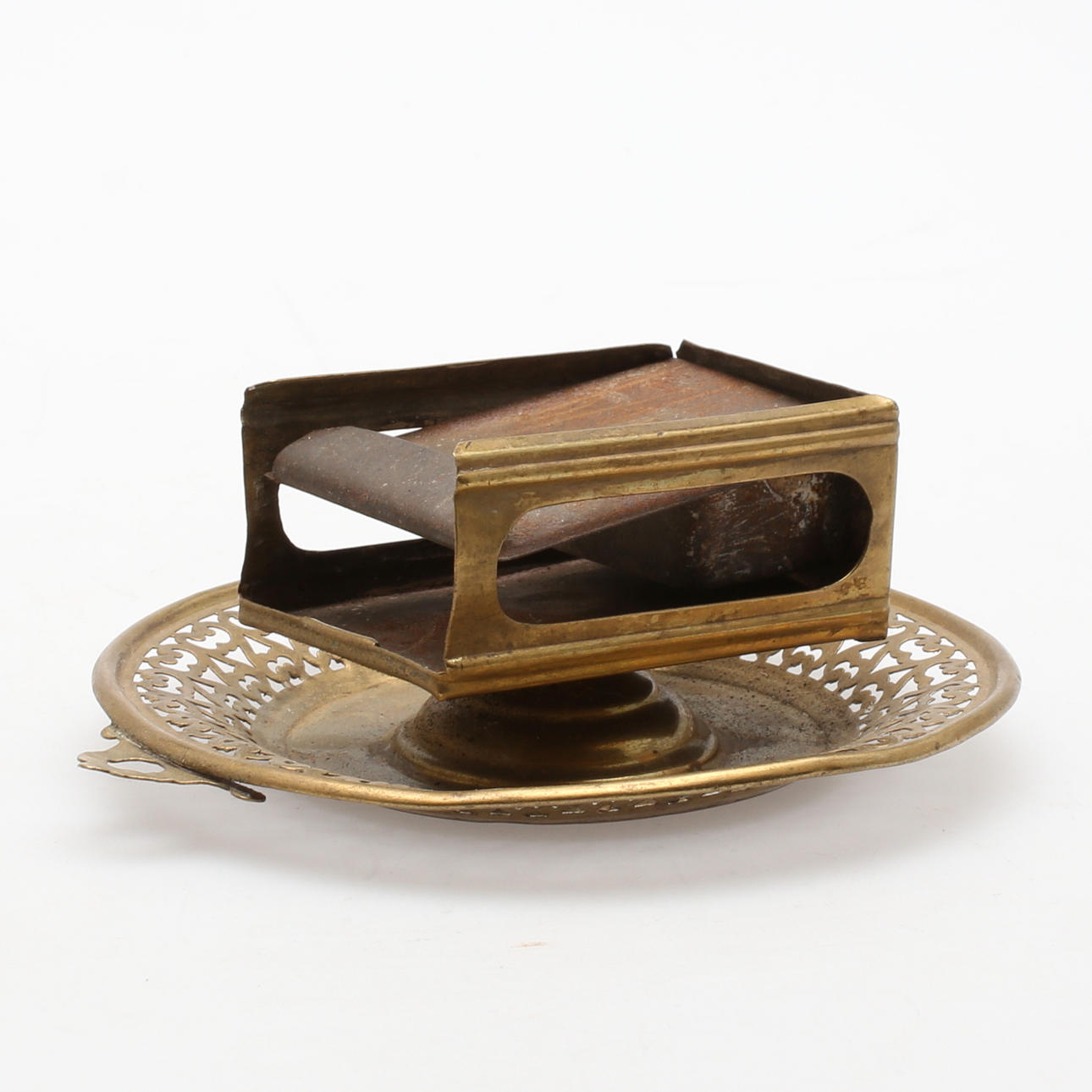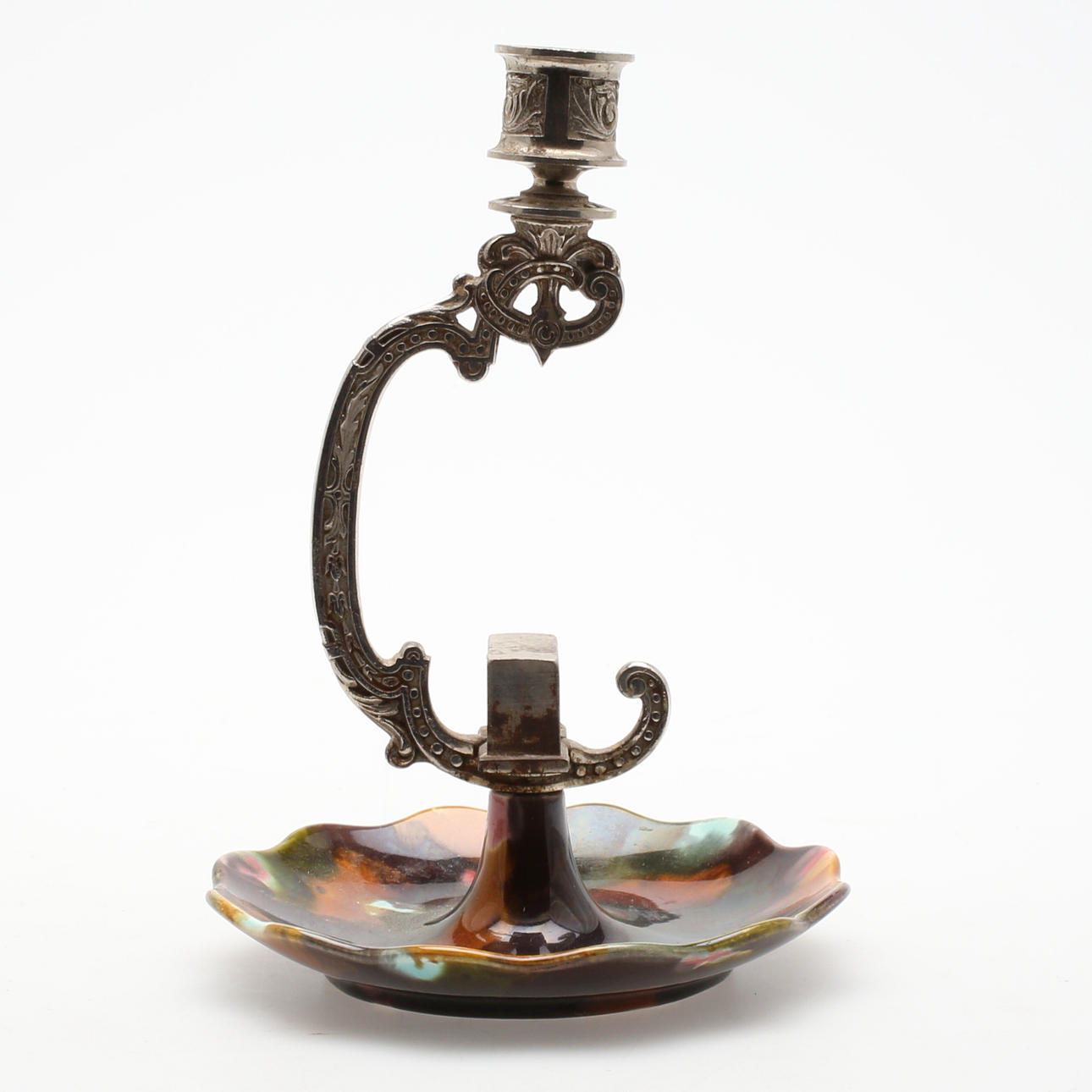 Ljusstake/tändsticksaskhållare, vitmetall/majolika, Rörstrand, höjd 23 cm.