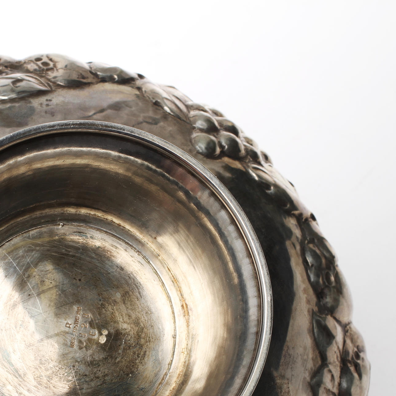 Med dekor av frukter i relief. Märkt 6828 C. Svenska importstämplar. Diameter ca 19 cm. Vikt ca 32g g.