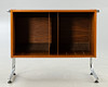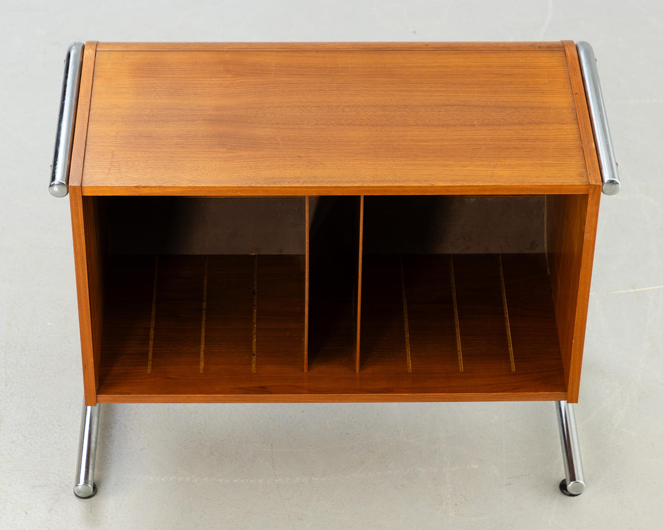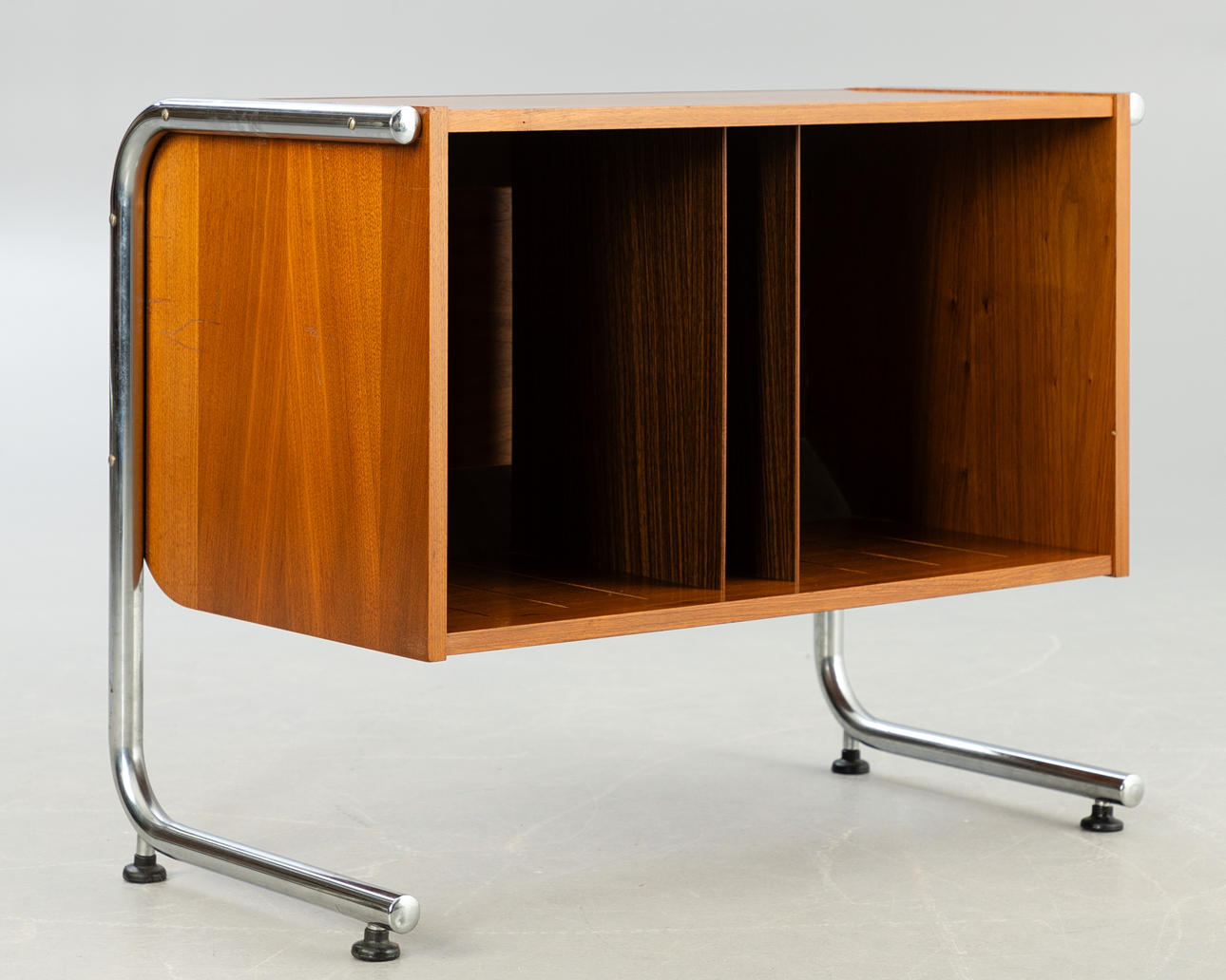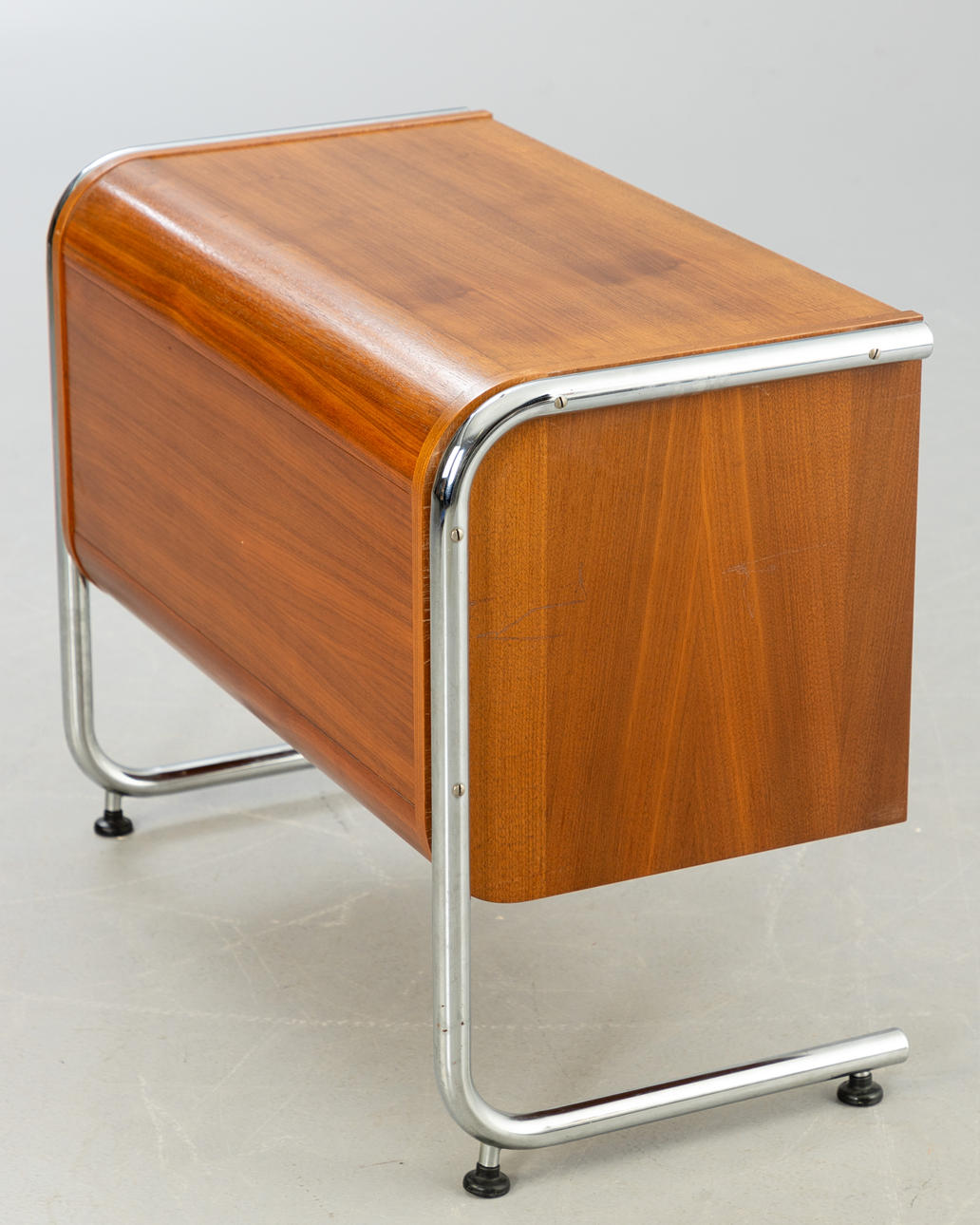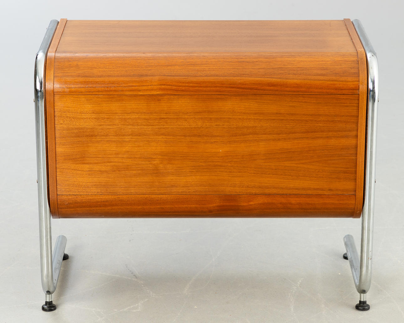 valnötsfanér. Rörformig stålram, förkromad. ca Höjd 62 cm x B 77 cm x D 40 cm.