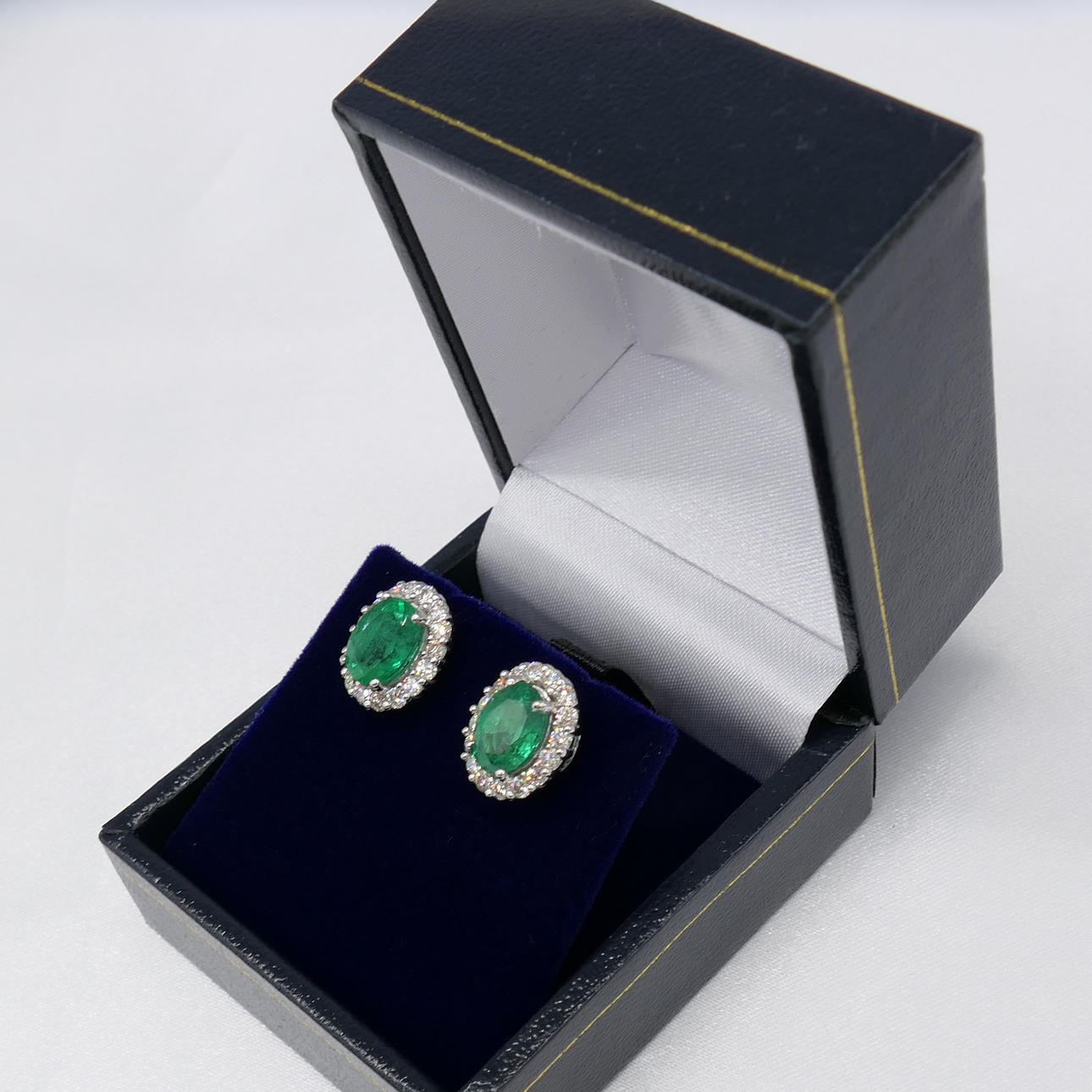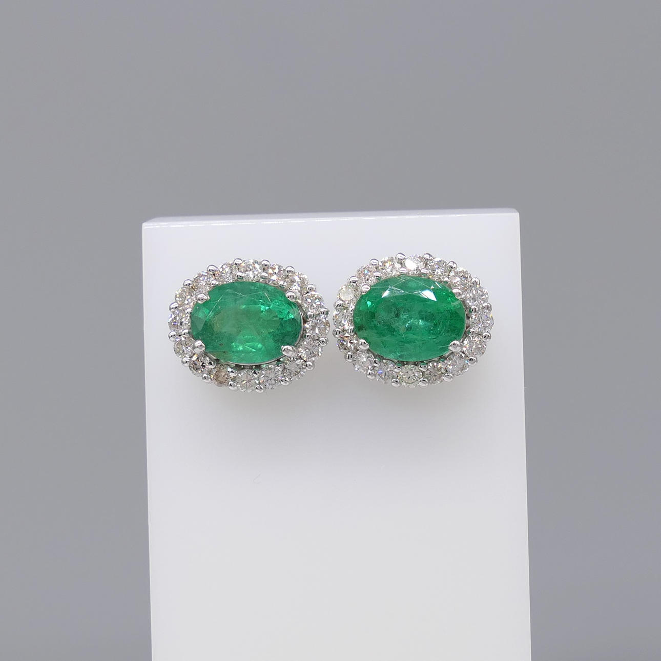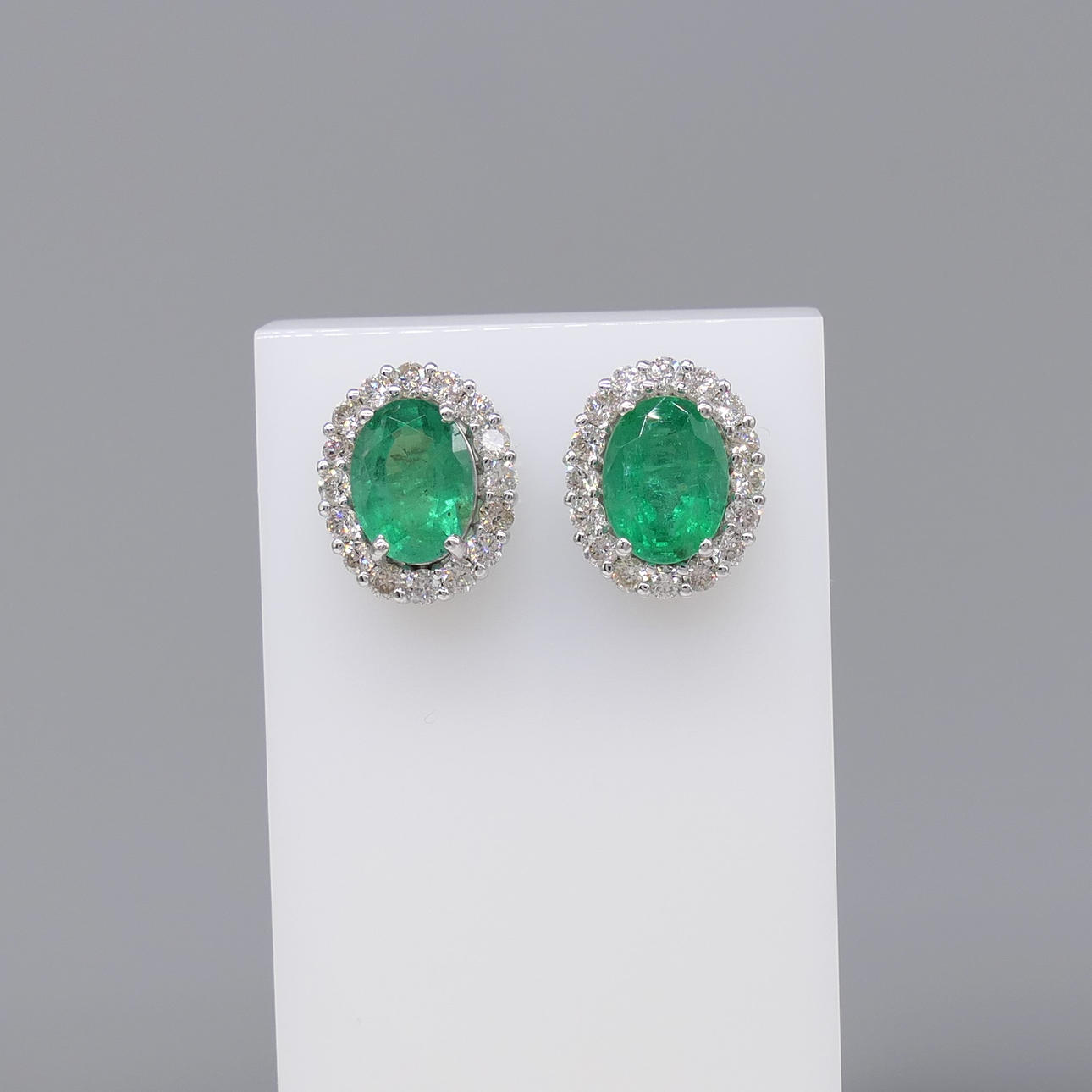 ÖRHÄNGEN, ett par traditionella ovalslipade smaragder och runda briljantslipade diamanter, 18k vitguld.