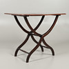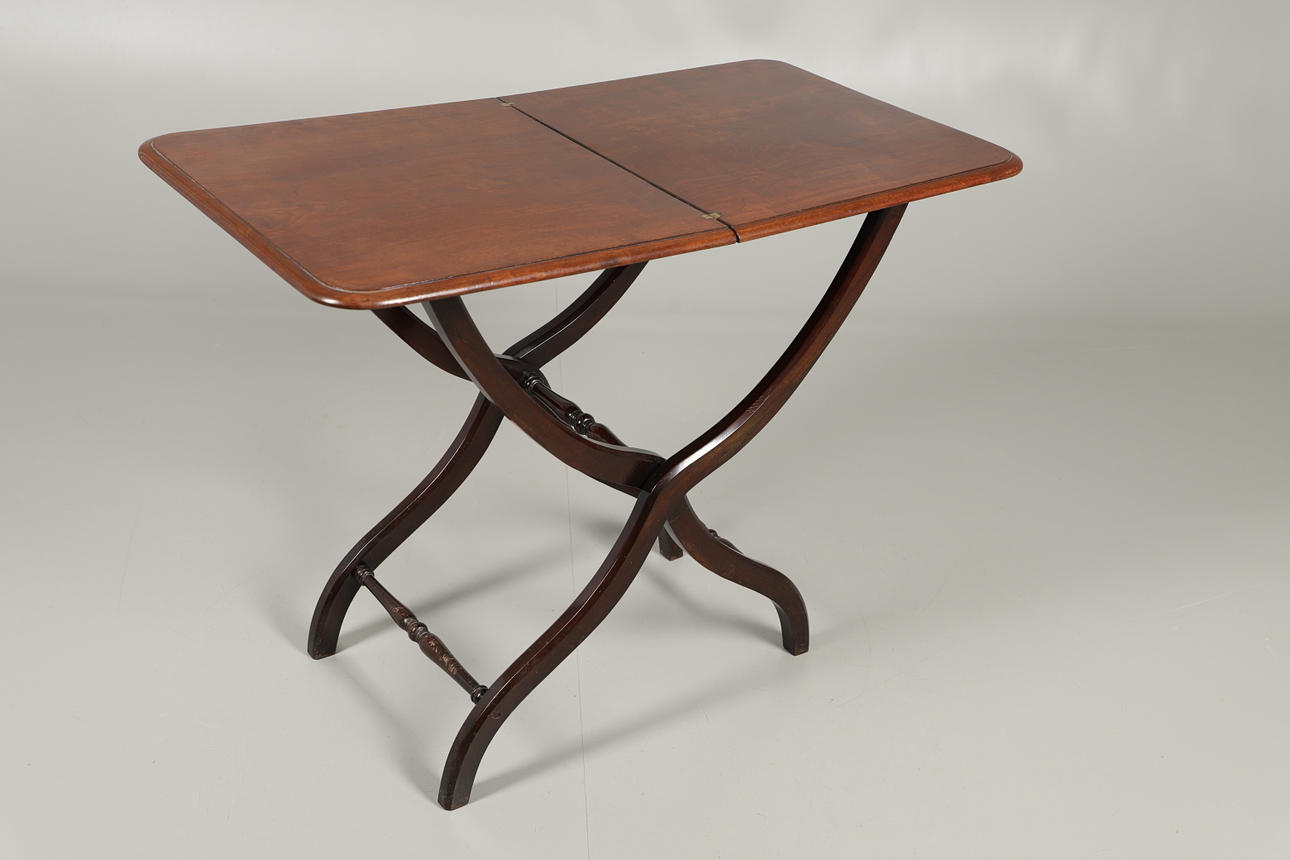 Med vridna bårar på en hopfällbar x-ram. Mässing gångjärn. Utfälld; Höjd 73cm x Längd 96cm x Djup 52cm. Vikad höjd 112cm.