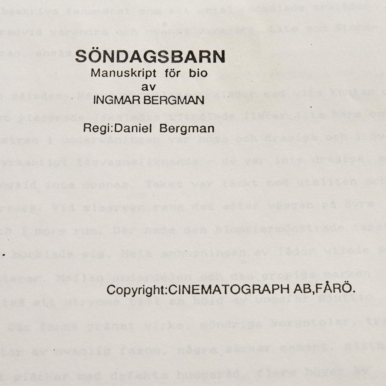 3109653. SÖNDAGSBARN, Manuskript för bio av INGMAR BERGMAN. Regi: Daniel Bergman.