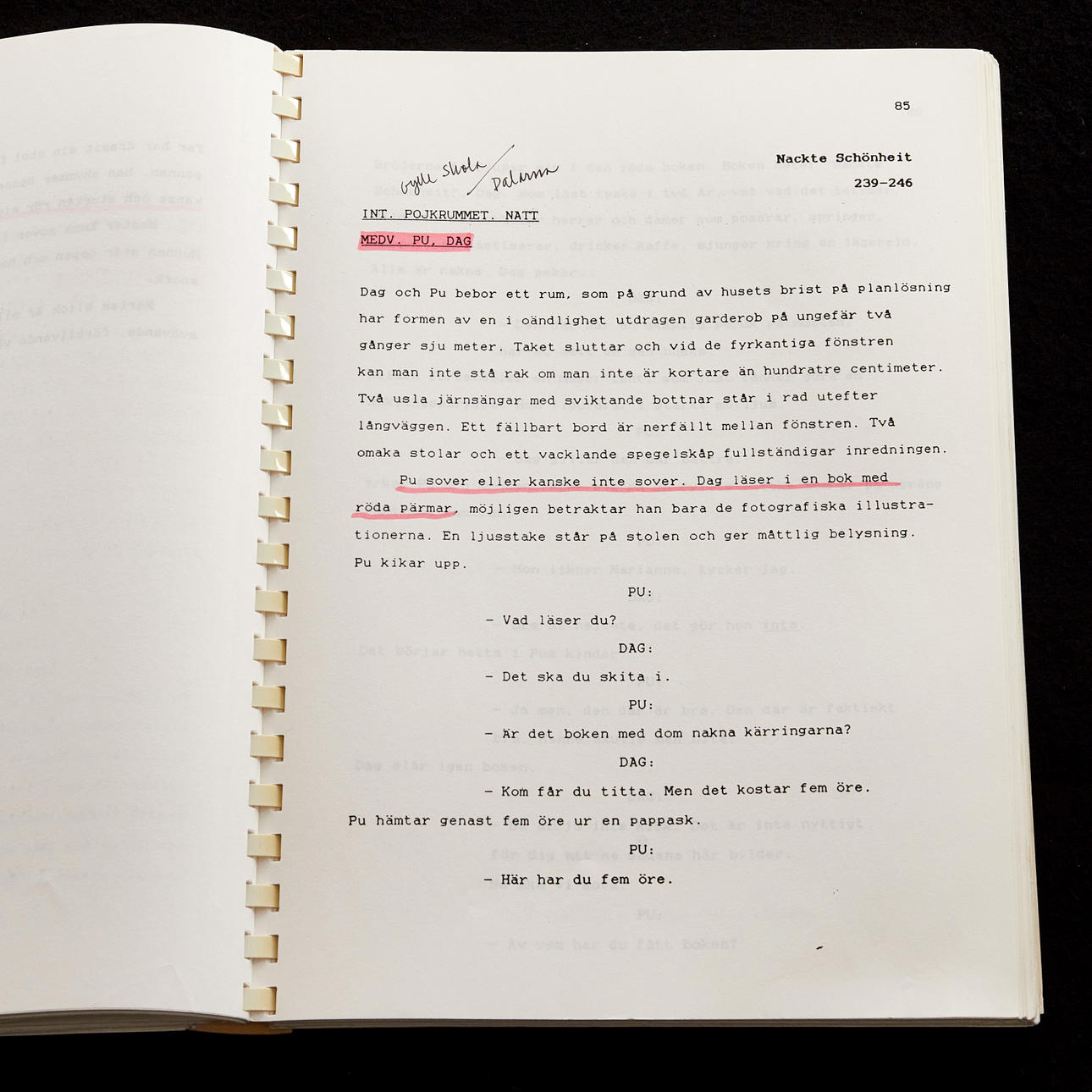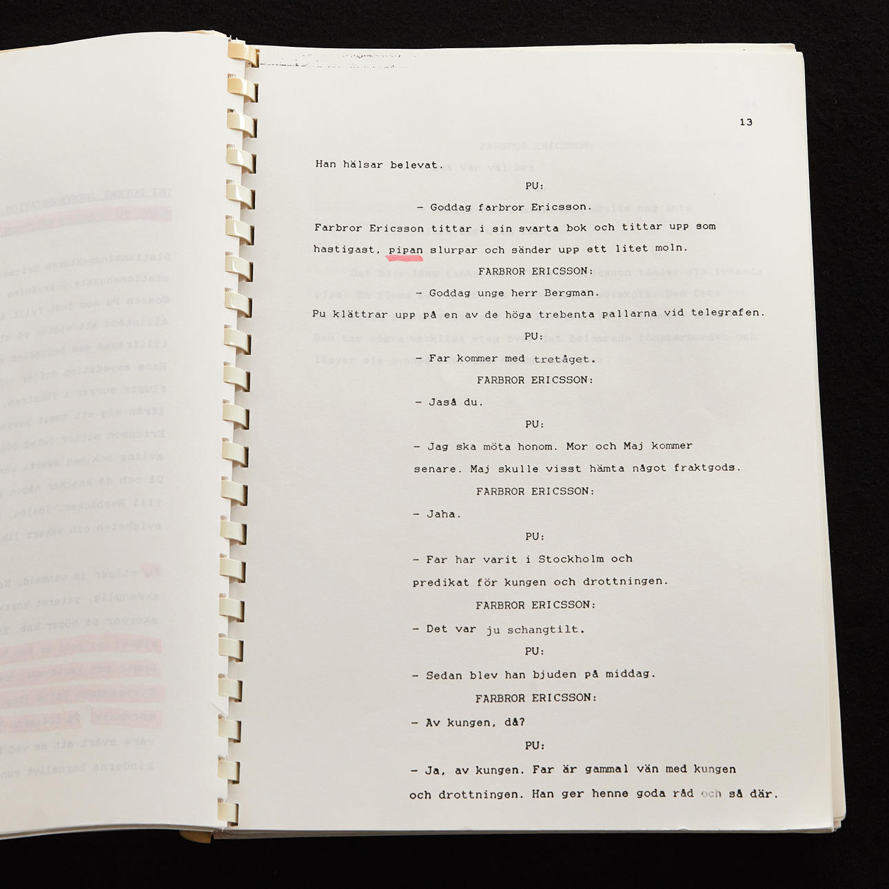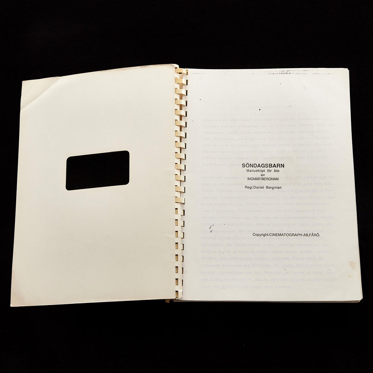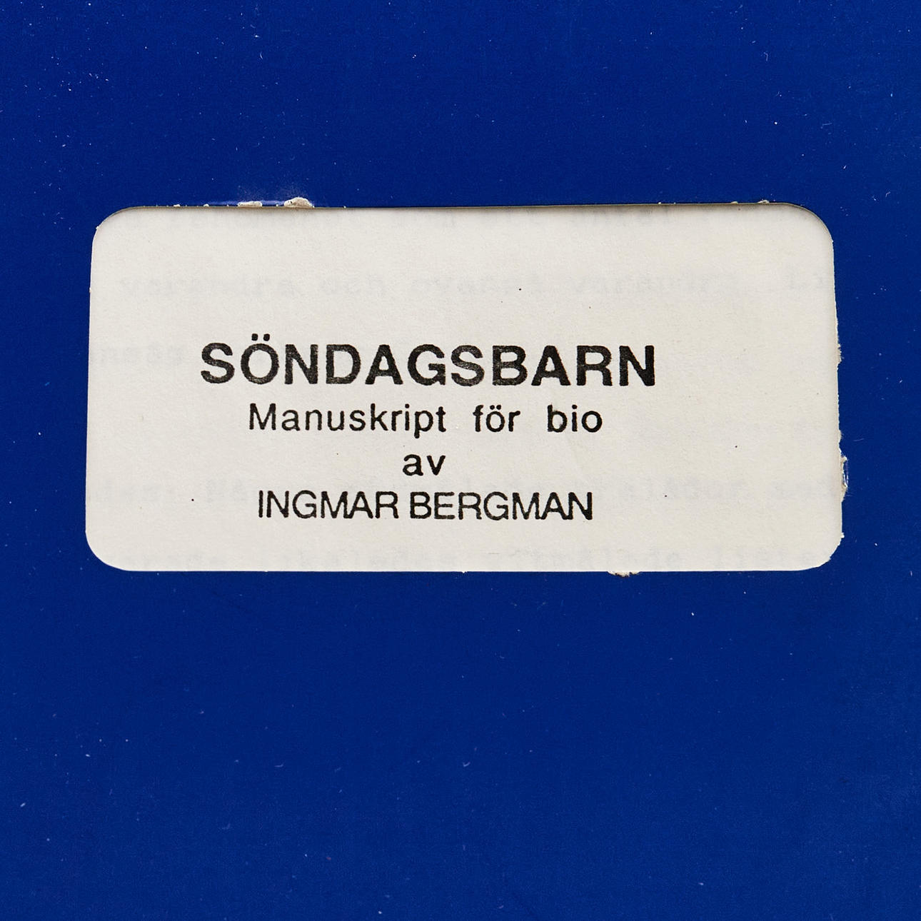 Originalmanus med pappersomslag från inspelningen av Söndagsbarn skriven av Ingmar Bergman och regisserad av hans son Daniel Bergman. 216 numrerade manussidor. Många sidor med handskrivna noteringar och överstrykningar med mera.