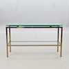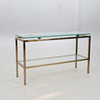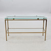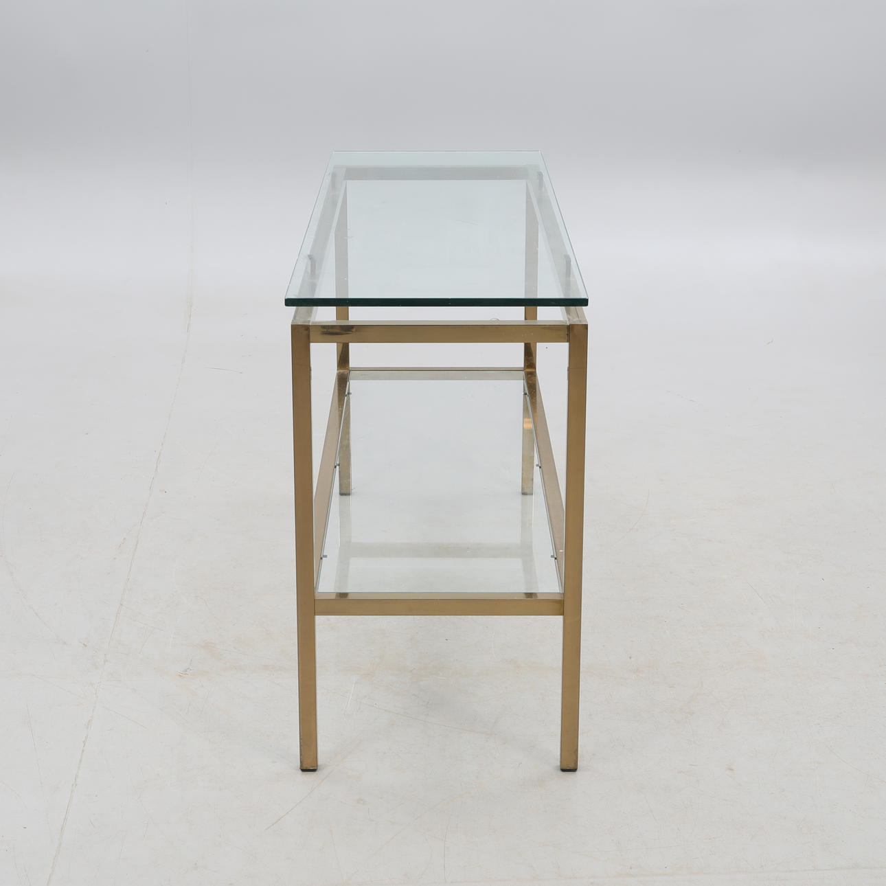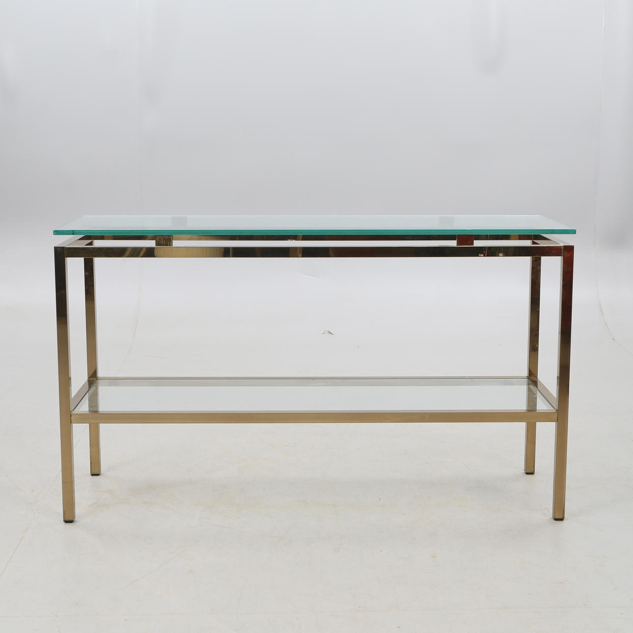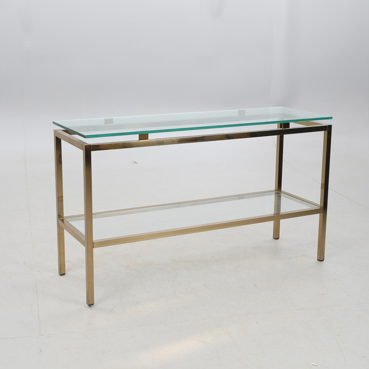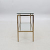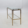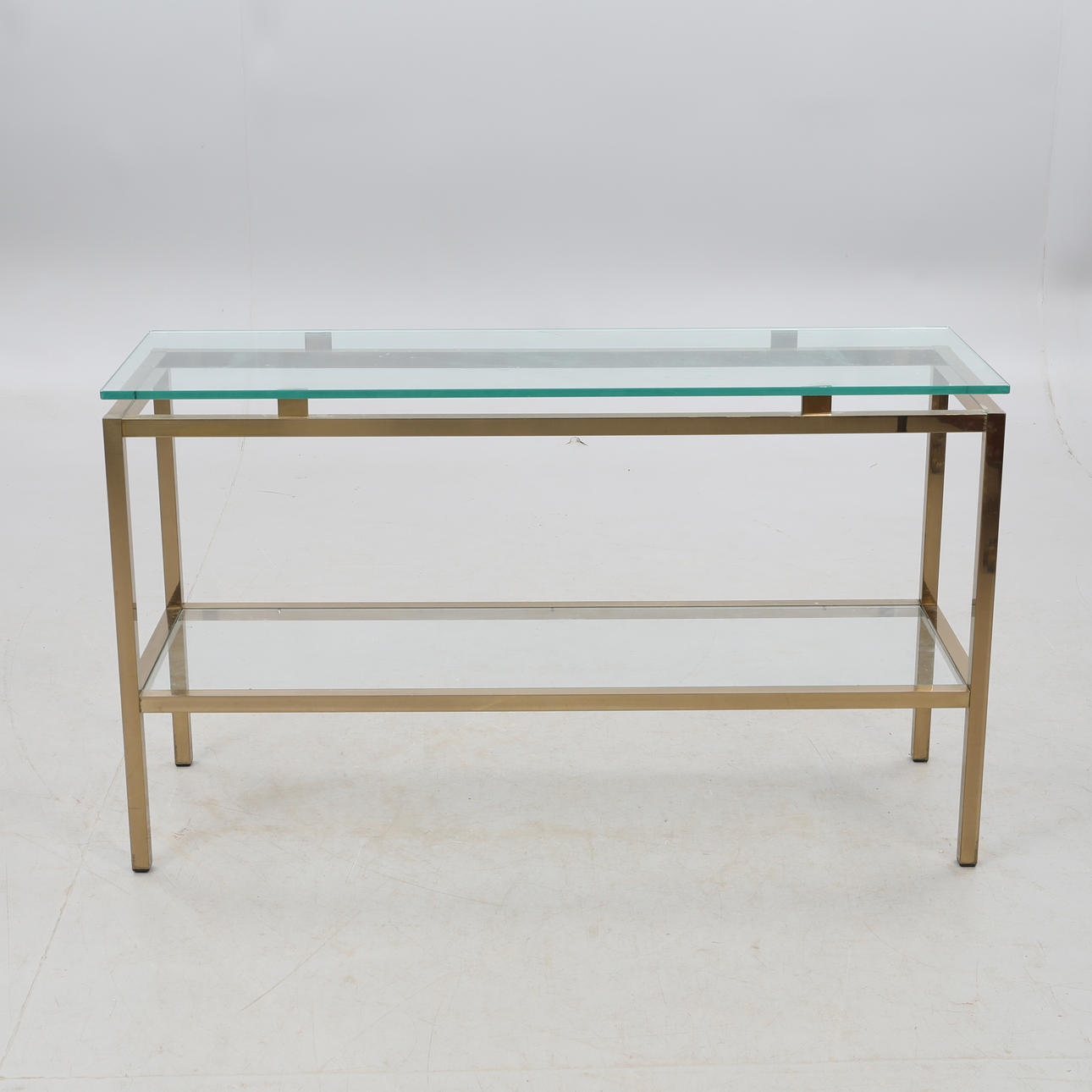 Metallstomme i mässingsfinish, två hyllplan i klarglas, 120x40 cm, höjd 70 cm.