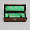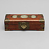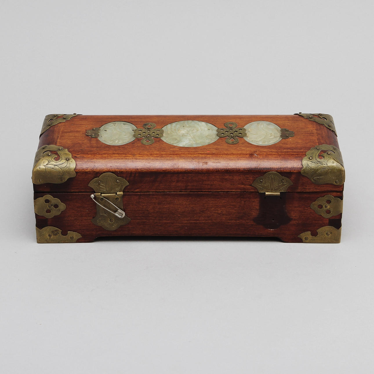 Trä. Dekor av beslag i gulmetall samt stenar. Längd 26 cm.