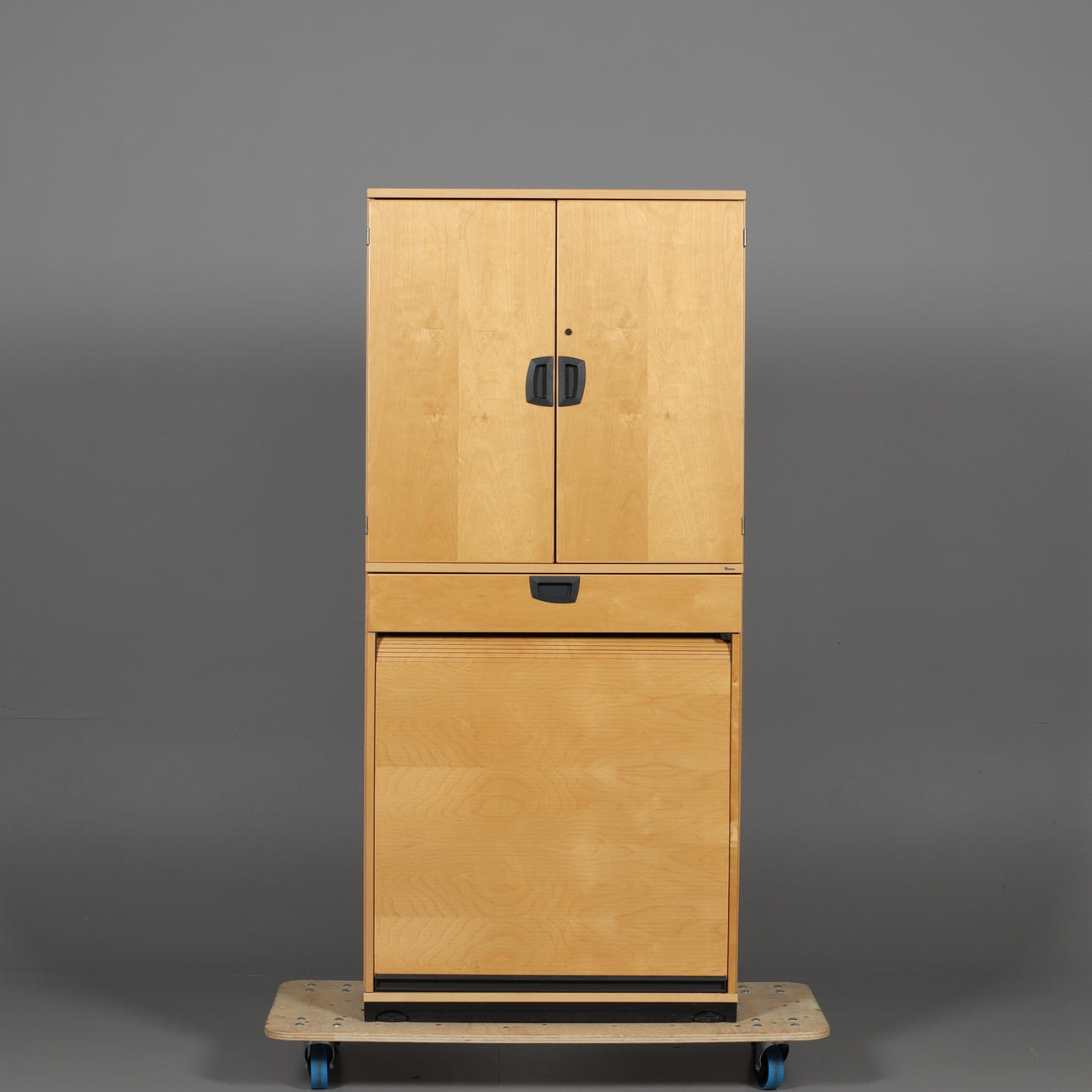 2 st skåp, underdelar med jalusidörr, överdelar med luckor, inkl. inredning, Kinnarps samt Edsbyn.