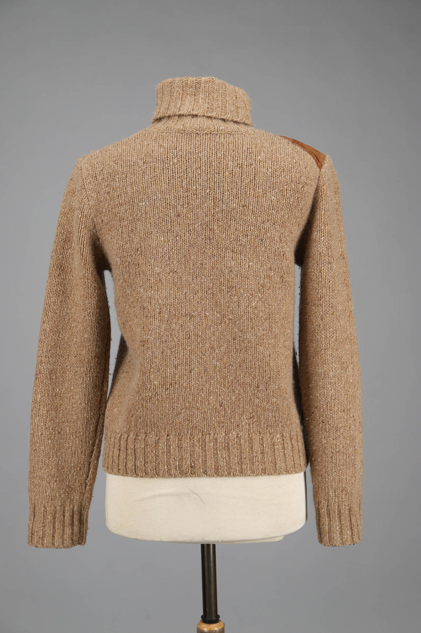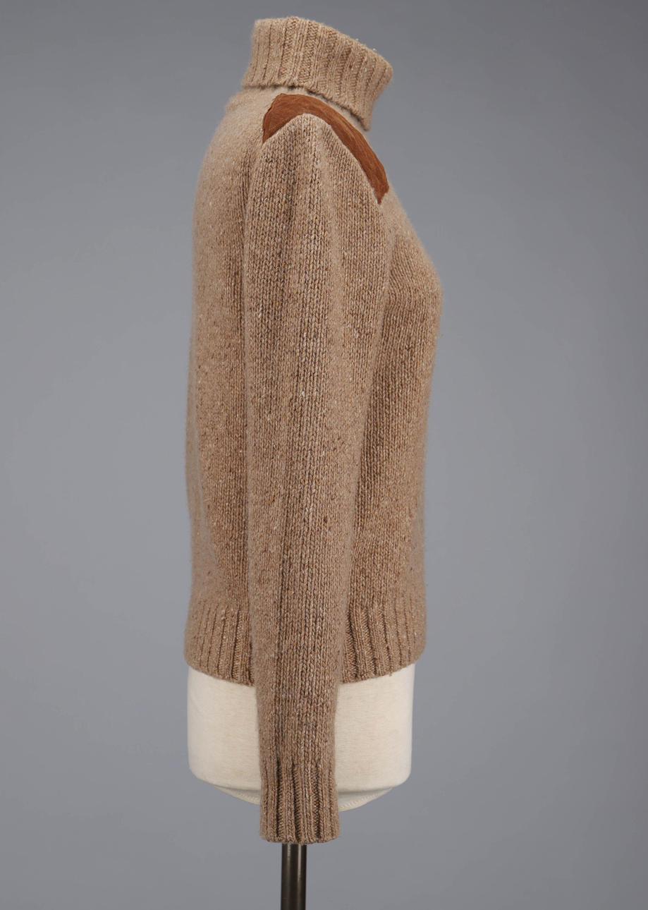 Stickad polotröja med mockaapplikation på ena axeln, 67 % ull och 33 % kashmir. Bystvidd ca 95 cm. Längd ca 56 cm.