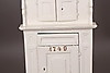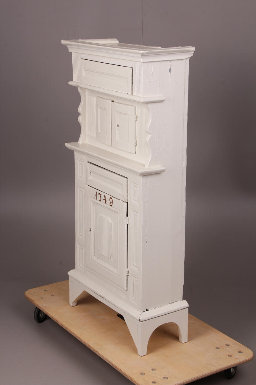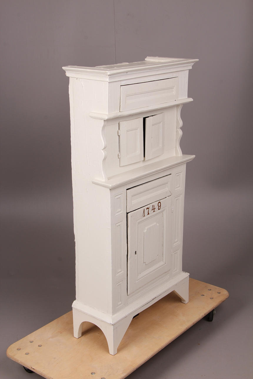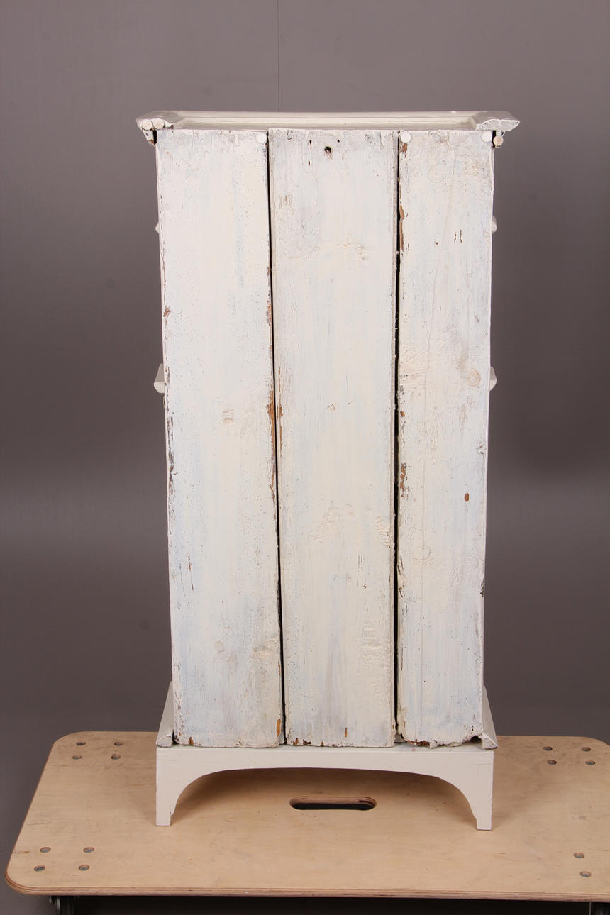 Senare lås, skeva skåpsdörrar (välvda) går ej att stänga helt, sprickor, skicket samt senare kompletteringar ej bedömda i sin helhet då skåpet är bemålat, färgsprickor.