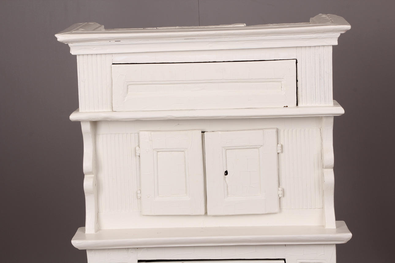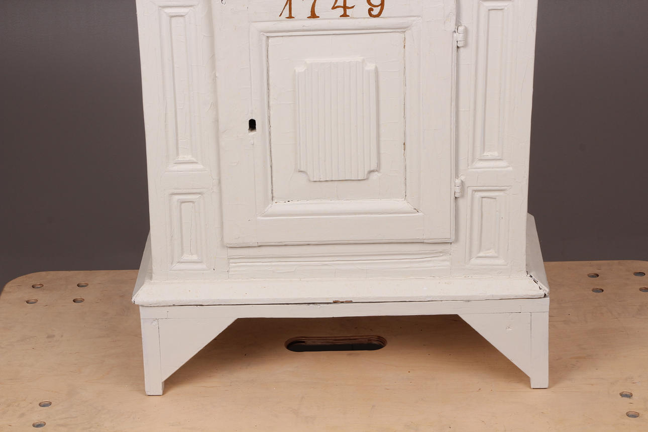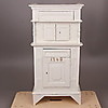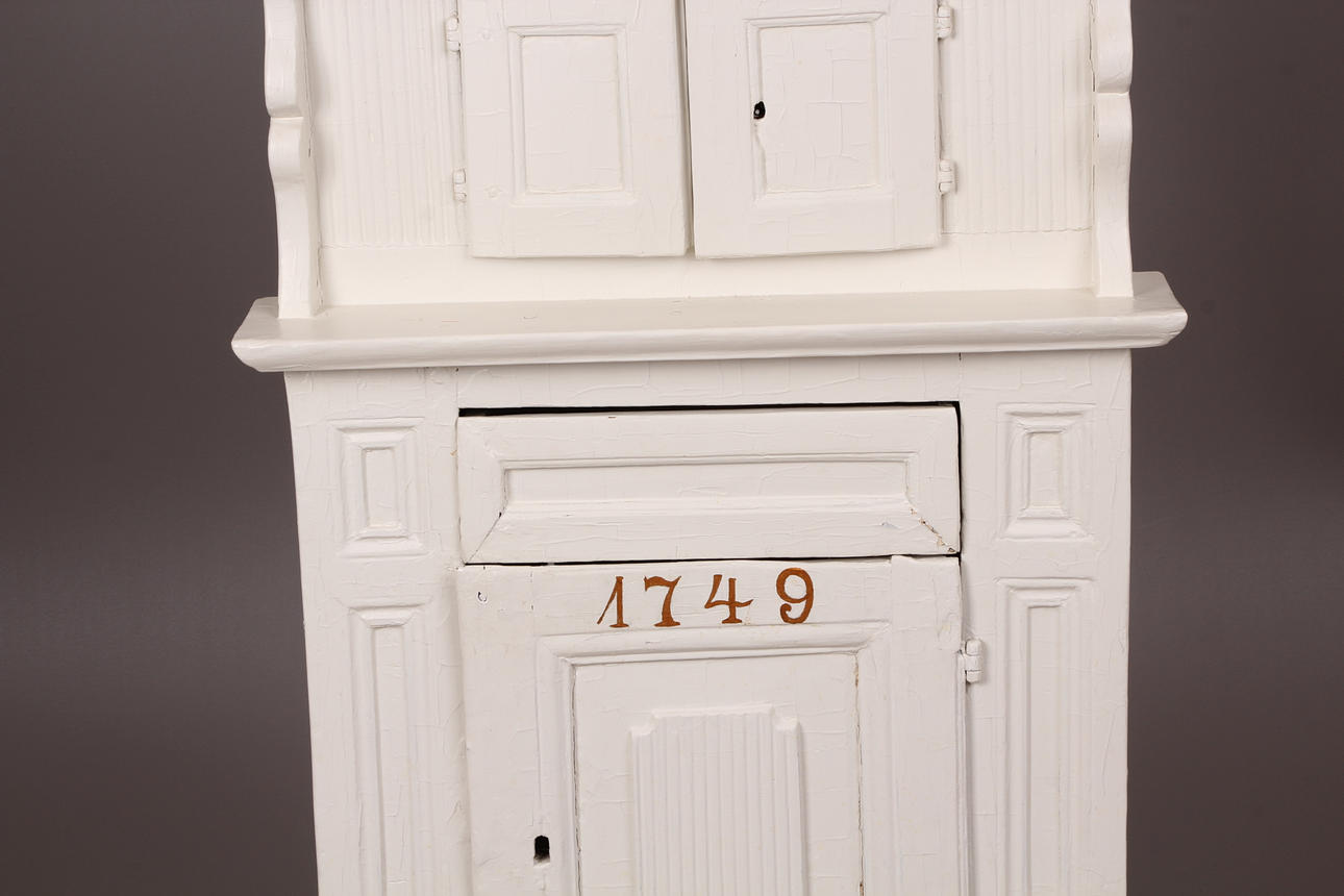 Senare lås, skeva skåpsdörrar (välvda) går ej att stänga helt, sprickor, skicket samt senare kompletteringar ej bedömda i sin helhet då skåpet är bemålat, färgsprickor.