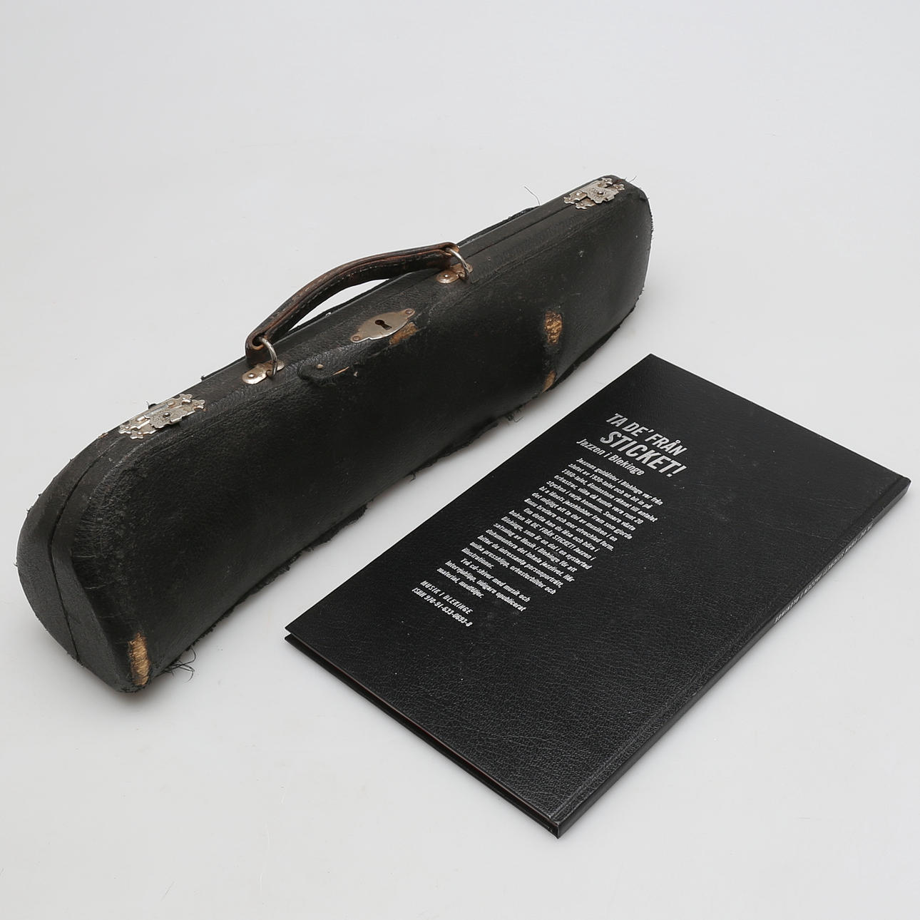 Klarinett med otydlig märkning och boken " Ta den från sticket", en bok om jazzen i Blekinge.