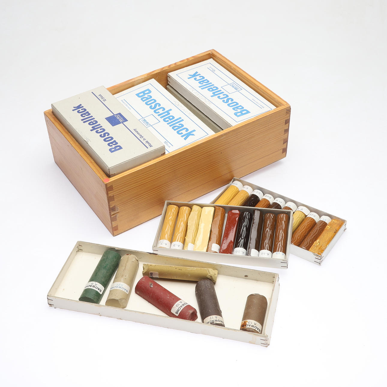 Mestdels obrukade (14 askar á 10 stycken) schellackstänger i olika nyanser. En ask med div. brukade vaxstänger i olika nyanser.