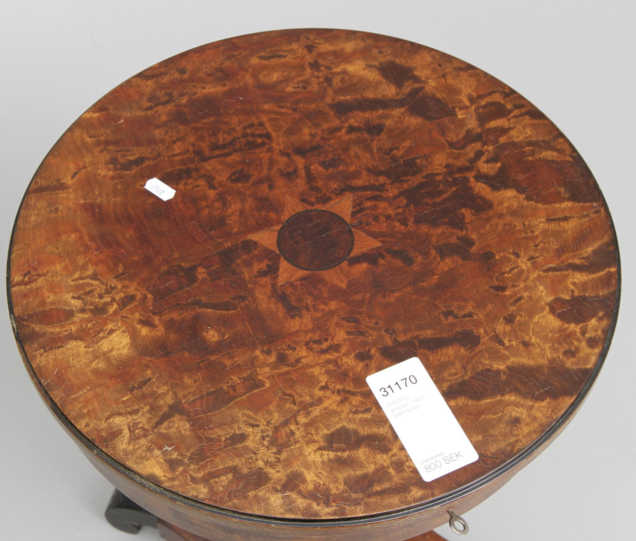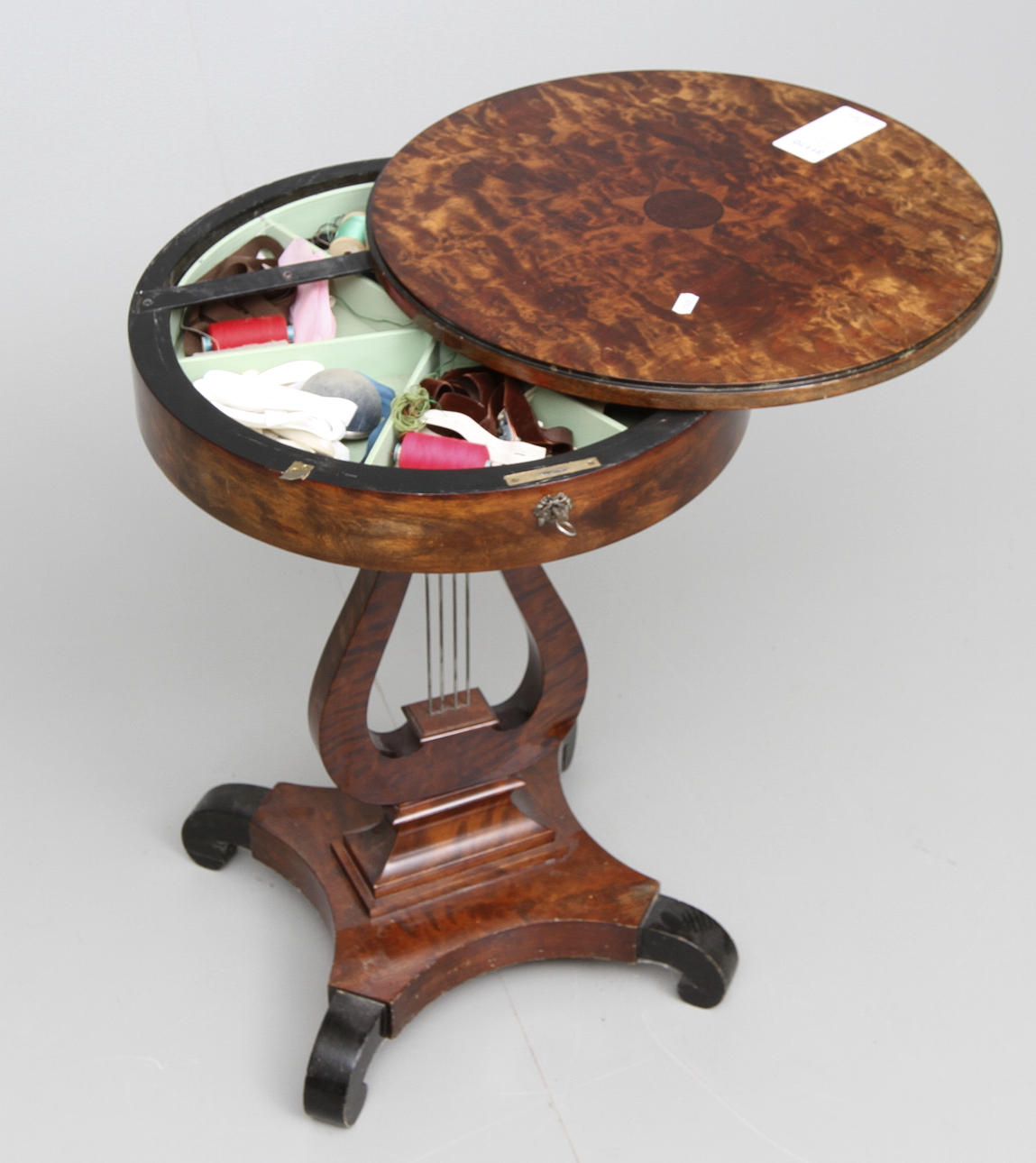 Rundad överdel på lyrformad fot, svängbar skiva med snurrbart fack för sytillbehör, fanerad i brunbonad björk med inläggningar i form av stjärna. Nyckel medföljer. Diameter 46, höjd 63 cm.