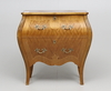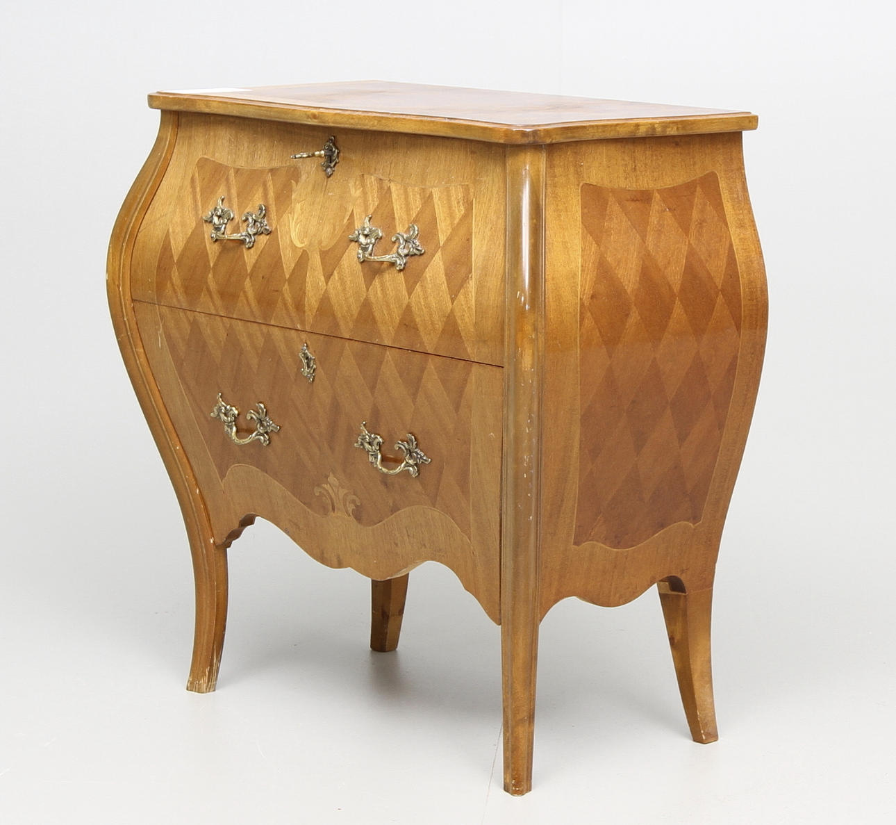 Bukformad, fanerad i mahony, ornament och rocailleformade handtag i brons. Nyckel medföljer. Längd 60, bredd 32, höjd 65.